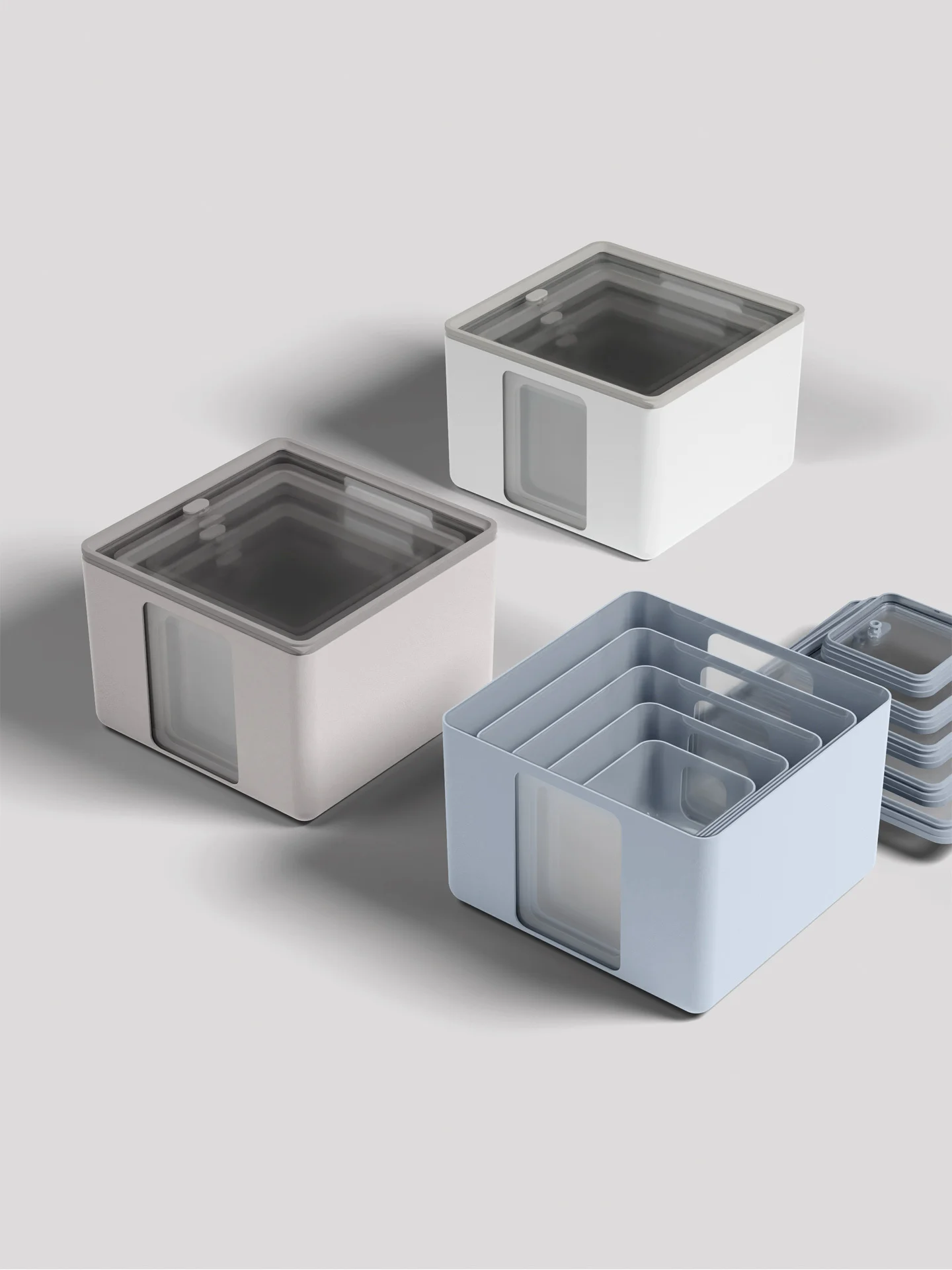 Zestaw pojemników dostępny jest w sześciu pastelowych kolorach, które można ze sobą łączyć, tworząc ciekawe trzech różnych rozmiarach można wkładać jeden w drugi, co pozwala na efektywne przechowywanie i oszczędność miejsca.