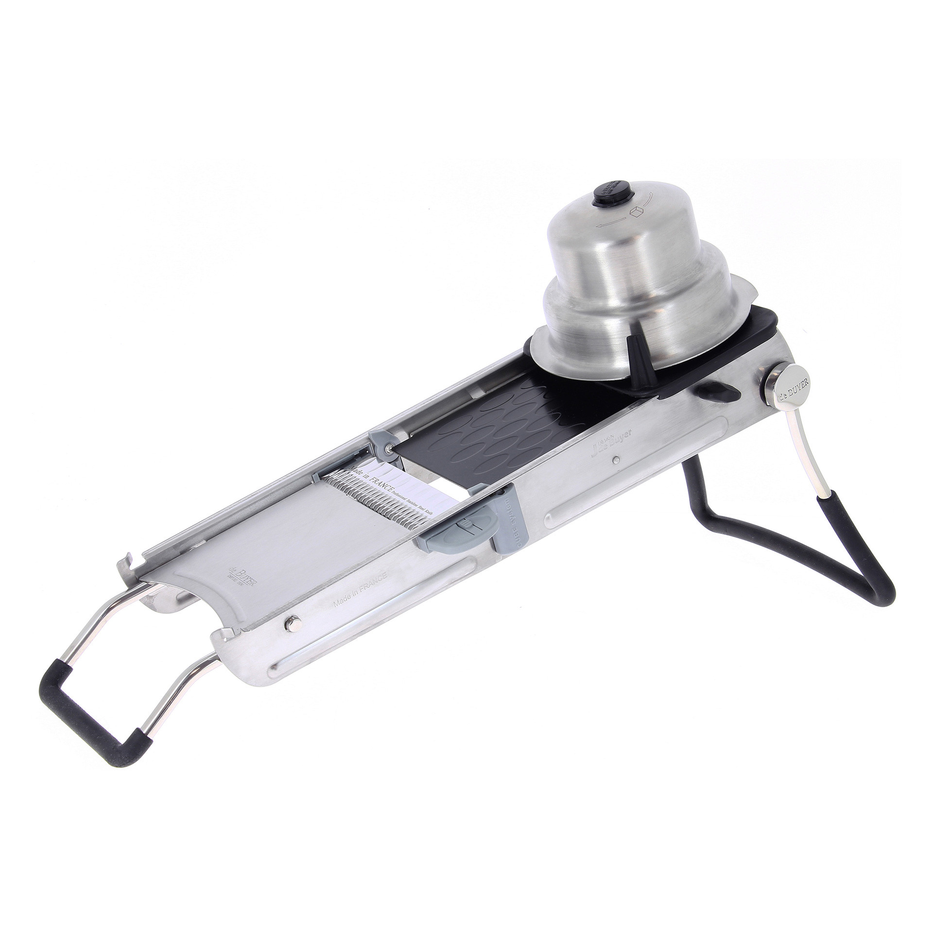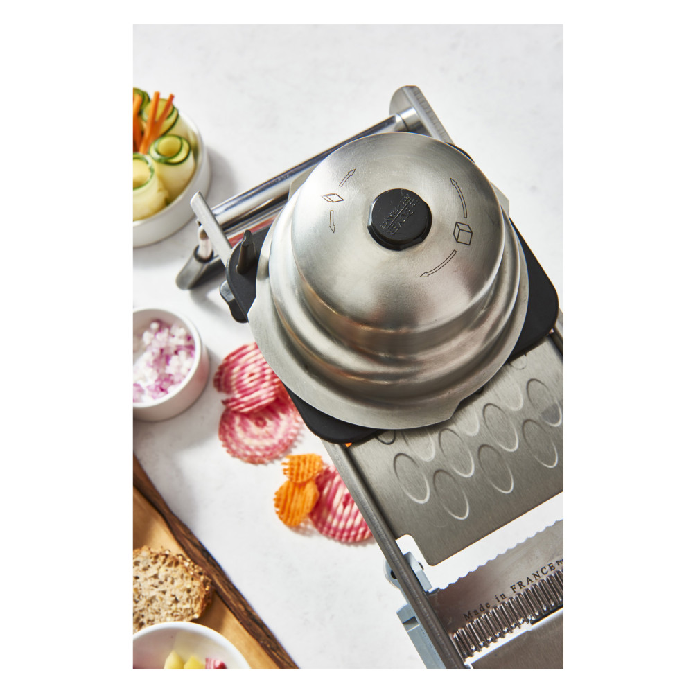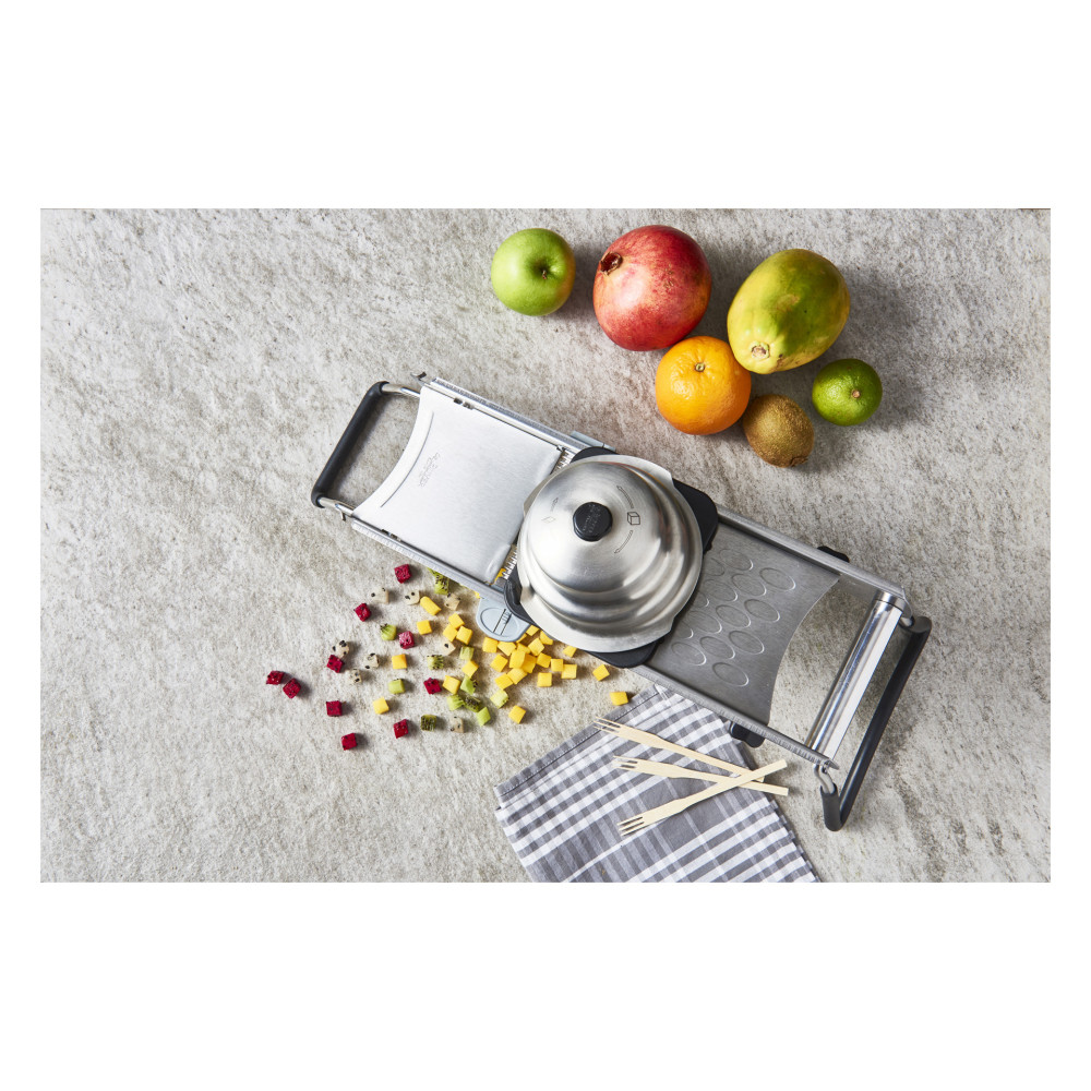 Posiada podwójne poziome ostrze (gładkie i faliste) oraz 3 ostrza Julienne: 2,4,10 mm.