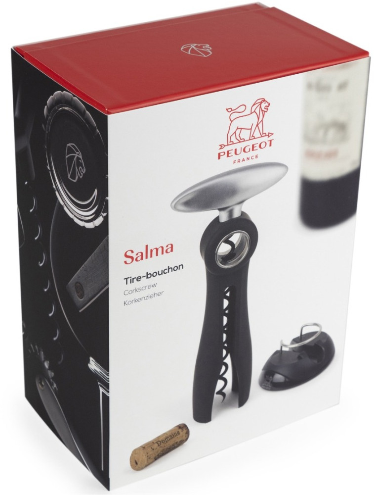 Korkociąg Peugeot Salma jest wyposażony w system spiralny, który jednym ruchem może otworzyć dowolną butelkę. Pomysłowy akcentem jest to, że podstawa korkociągu jest zarazem użytecznym przecinakiem do foli.