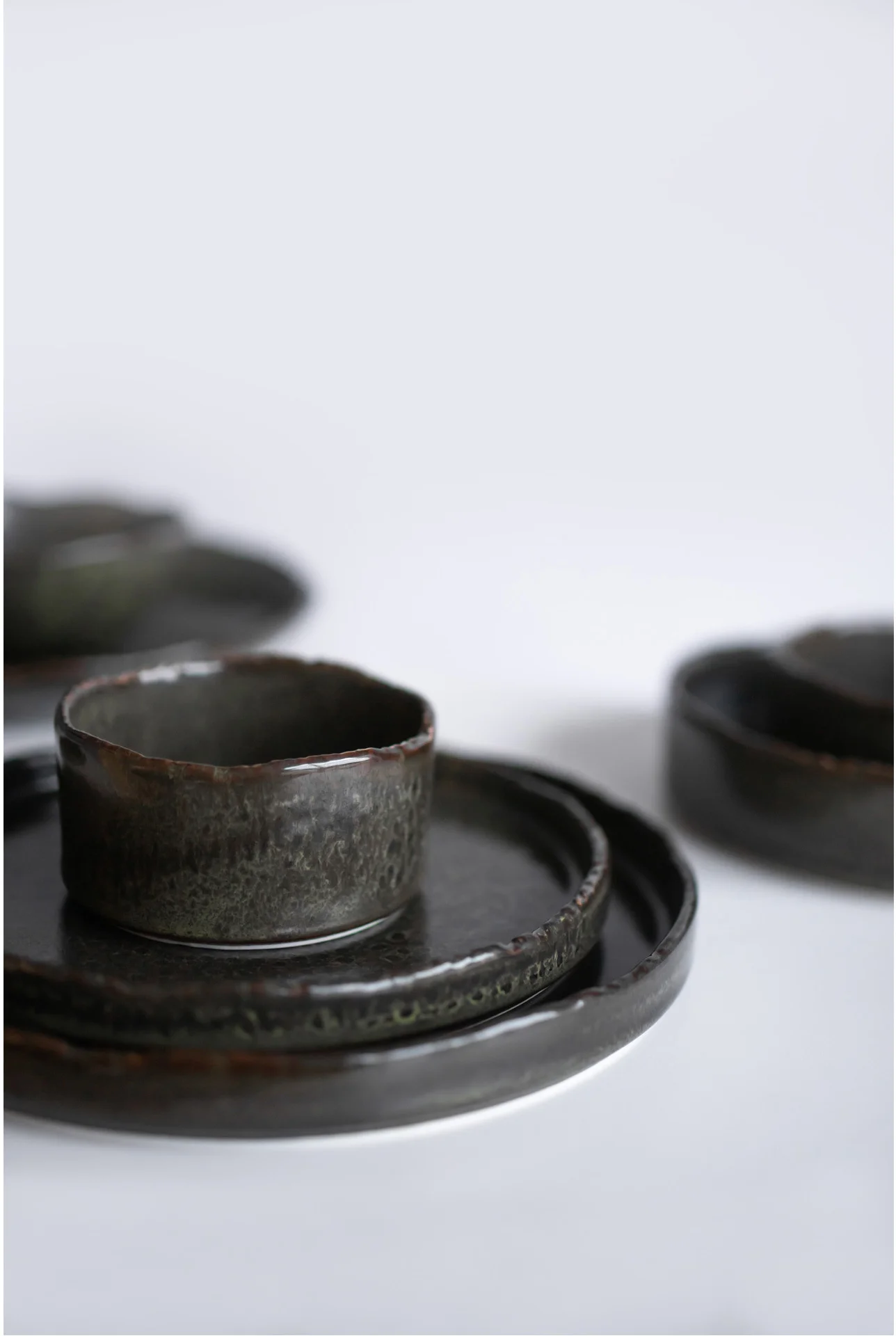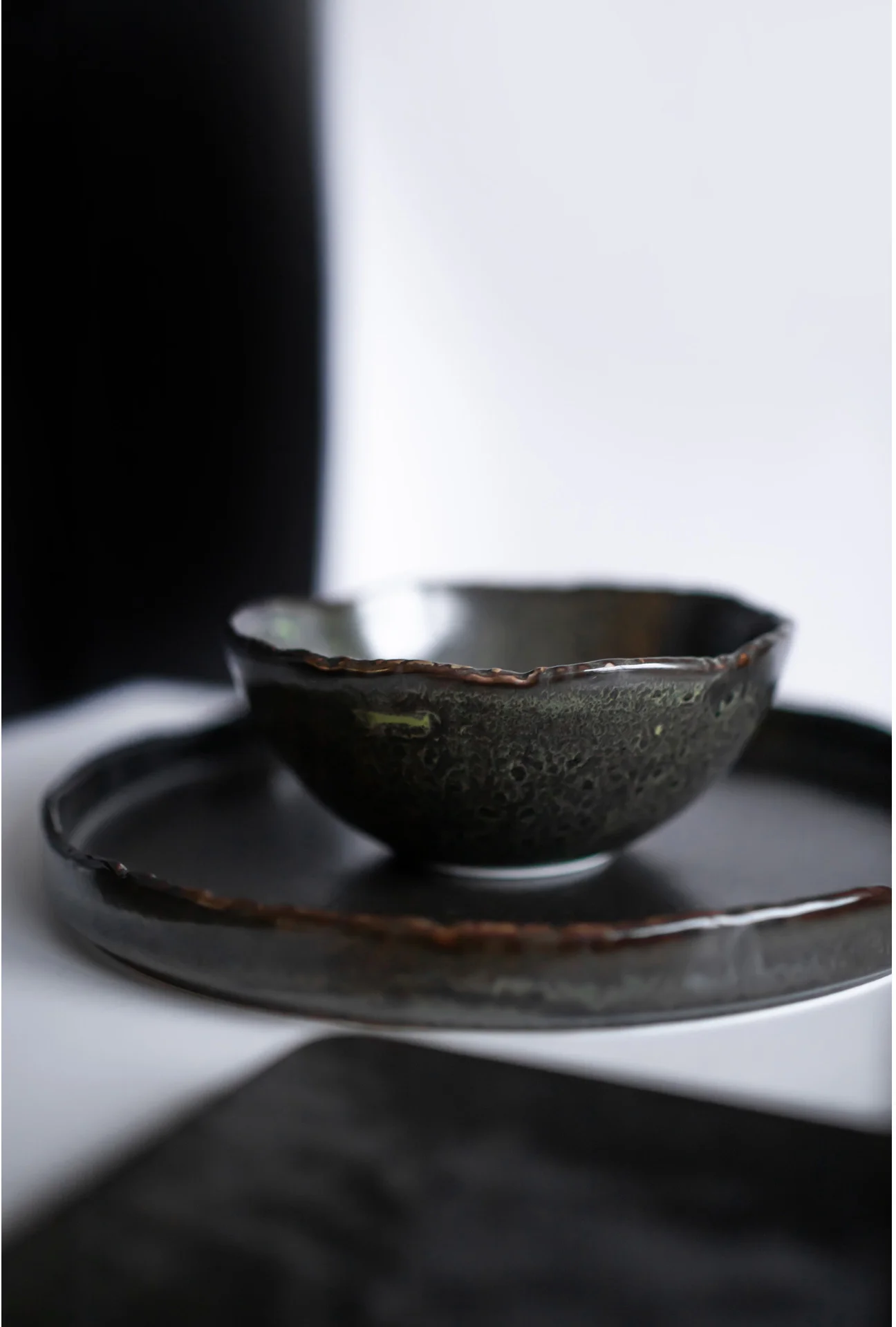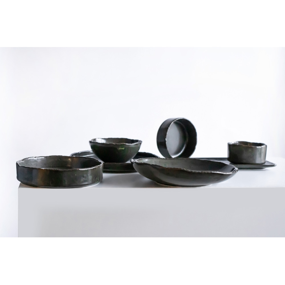 Prosta, minimalistyczna forma tych naczyń oraz ciemna kolorystyka pięknie skomponuje się zarówno w minimalistycznej aranżacji kuchni czy jadali, jak również w bardziej rustykalnych wnętrzach. Subtelne, półmatowe wykończenie naczyń wspaniale podkreśla lekko nakrapianą glazurę i przenikanie się barw. Dodatkowo, nieregularnie wykończone brzegi nadają każdemu naczyniu indywidualny