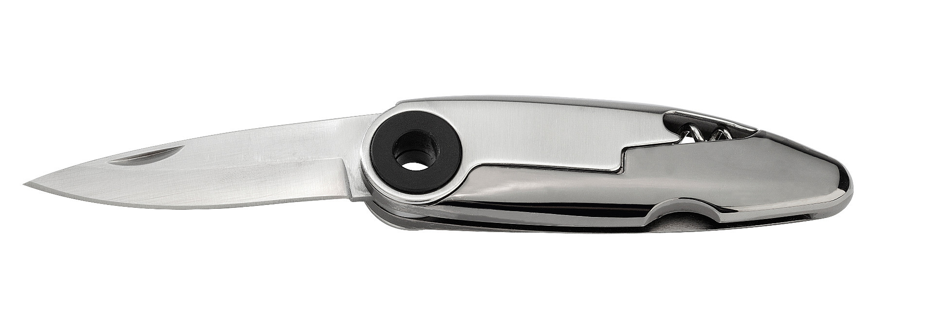 Wykonany ze stali nierdzewnej nożyk z łatwością przetnie folię znajdującą się na szyjce butelki. Ostrze noża ze stali nierdzewnej o długości 9,4 cm automatycznie blokuje się przed złożeniem – usłyszysz charakterystyczne kliknięcie. Aby zamknąć nóż z powrotem, należy nacisnąć pierścień na rękojeści, co ponownie otwiera blokadę. Wtedy można opuścić nóż. Spiralny otwieracz do butelek, zgrabnie ukryty w oprawie scyzoryka, odkorkuje każdą butelkę wina. Trzecia funkcja, to praktyczny otwieracz do kapsli, który znajdzie przydatne zastosowanie w wielu sytuacjach.
