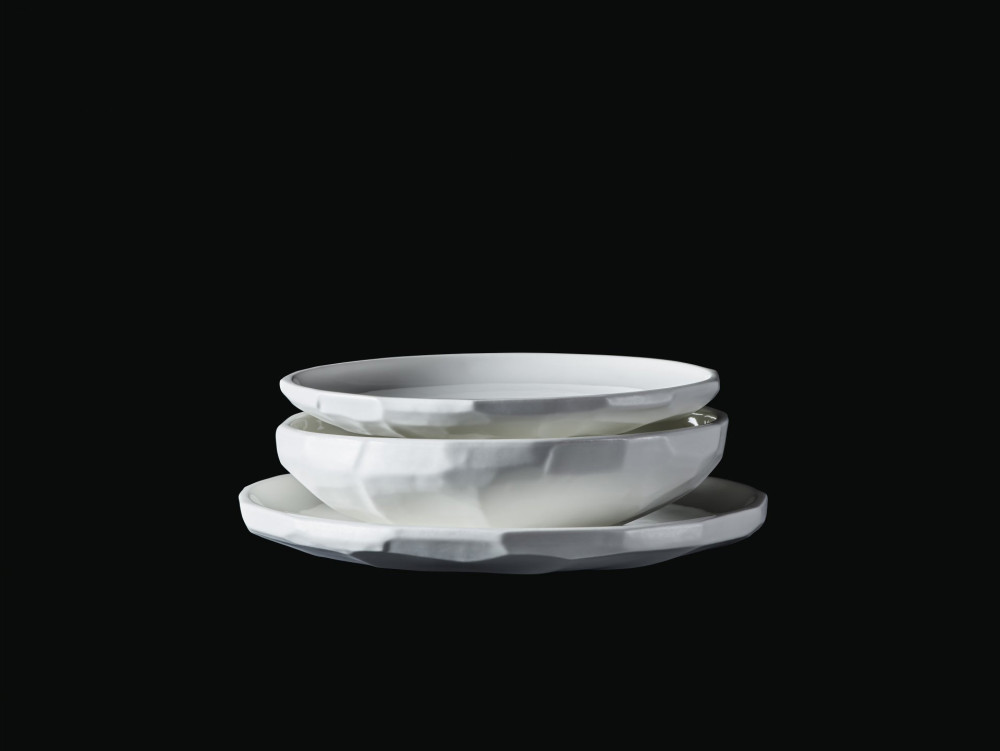 Na kolekcję składają się talerze o nieregularnych kształtach i asymetryczne misy - w trzech kolorach (białym, brązowym i błękitnym).