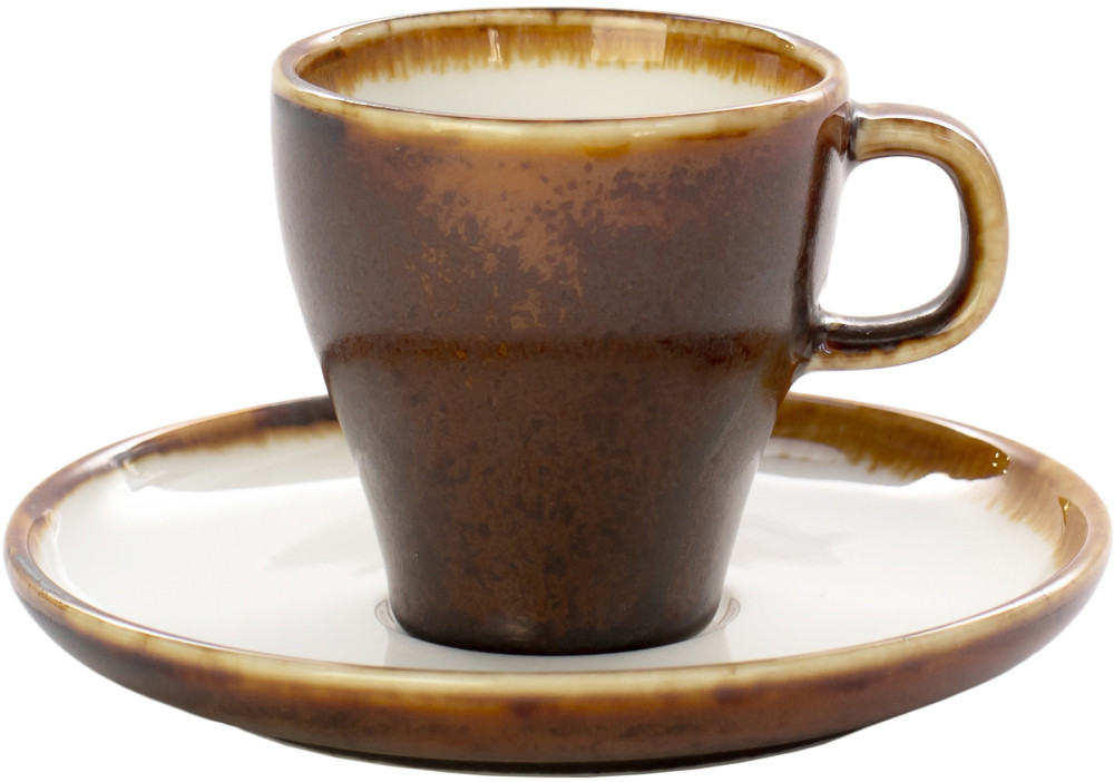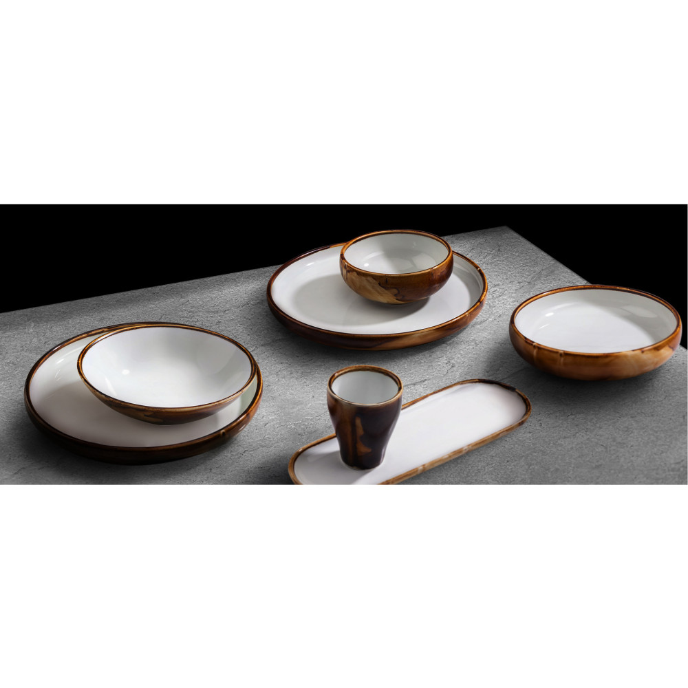 Połączenie dwóch kontrastujących kolorów oraz wysokiego połysku szkliwa daje zachwycający efekt. Mocna forma naczyń i solidna grubość porcelany dodaje tej kolekcji rustykalnego charakteru. Dodatkowy efekt przebarwień i nierównomiernego rozmieszczenia kolorów na zewnętrznej powierzchni naczyń, uzyskany został dzięki specjalnej metodzie wykorzystania szkliwa reaktywnego. W jej wyniku na powierzchni filiżanek, mis, półmisków i talerzy powstają nieregularne dekoracje. Do złudzenia wyglądają jakby powstały w sposób naturalny. Zewnętrzna brązowo-rdzawa barwa przenika delikatnie do wnętrza naczynia i łączy się subtelnie z odcieniem „lodowatej” bieli. Ten niesamowity efekt to połączenie nowoczesności i nawiązanie do tradycyjnych form naczyń. Artystyczne postarzanie porcelany to obecnie bardzo modny trend w wystroju restauracji czy jadalni.