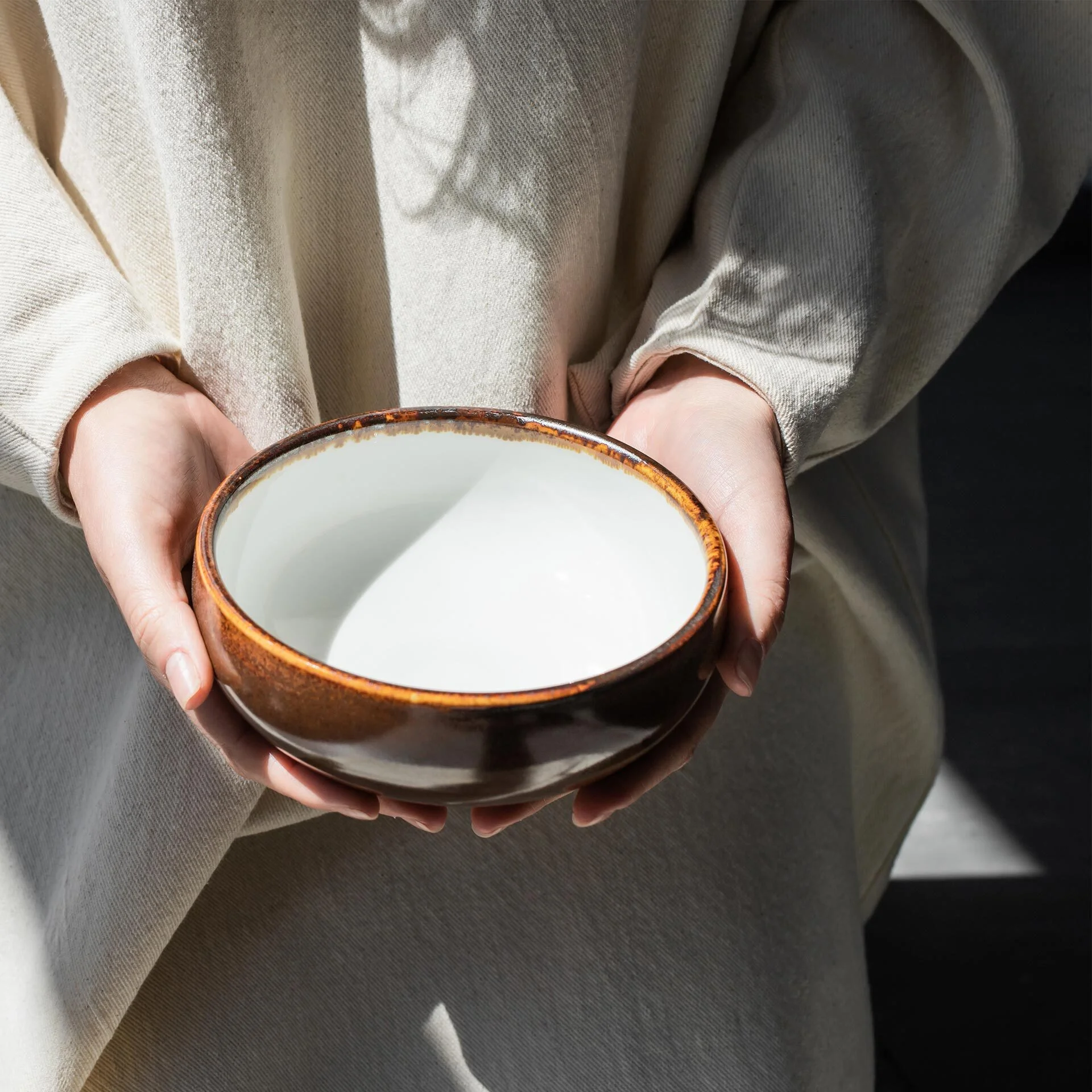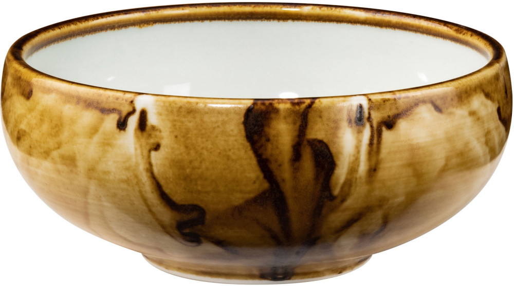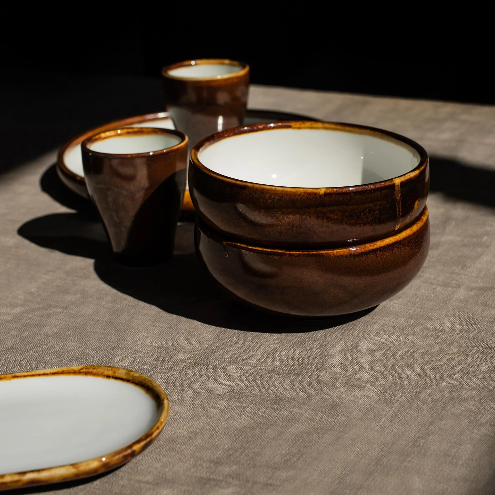 Połączenie dwóch kontrastujących kolorów oraz wysokiego połysku szkliwa daje zachwycający efekt. Mocna forma naczyń i solidna grubość porcelany dodaje tej kolekcji rustykalnego charakteru. Dodatkowy efekt przebarwień i nierównomiernego rozmieszczenia kolorów na zewnętrznej powierzchni naczyń, uzyskany został dzięki specjalnej metodzie wykorzystania szkliwa reaktywnego. W jej wyniku na powierzchni filiżanek, mis, półmisków i talerzy powstają nieregularne dekoracje. Do złudzenia wyglądają jakby powstały w sposób naturalny. Zewnętrzna brązowo-rdzawa barwa przenika delikatnie do wnętrza naczynia i łączy się subtelnie z odcieniem „lodowatej” bieli. Ten niesamowity efekt to połączenie nowoczesności i nawiązanie do tradycyjnych form naczyń. Artystyczne postarzanie porcelany to obecnie bardzo modny trend w wystroju restauracji czy jadalni.