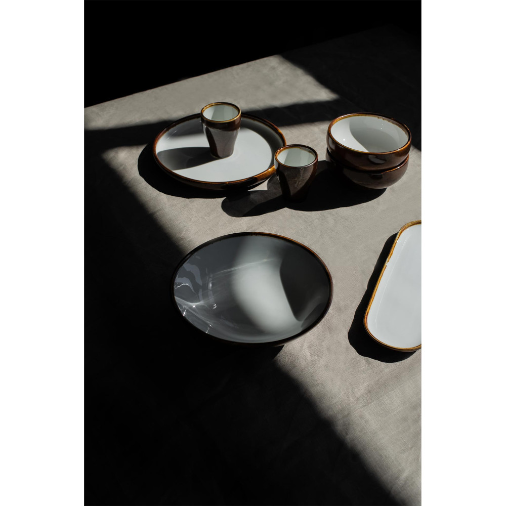 Połączenie dwóch kontrastujących kolorów oraz wysokiego połysku szkliwa daje zachwycający efekt. Mocna forma naczyń i solidna grubość porcelany dodaje tej kolekcji rustykalnego charakteru. Dodatkowy efekt przebarwień i nierównomiernego rozmieszczenia kolorów na zewnętrznej powierzchni naczyń, uzyskany został dzięki specjalnej metodzie wykorzystania szkliwa reaktywnego. W jej wyniku na powierzchni filiżanek, mis, półmisków i talerzy powstają nieregularne dekoracje. Do złudzenia wyglądają jakby powstały w sposób naturalny. Zewnętrzna brązowo-rdzawa barwa przenika delikatnie do wnętrza naczynia i łączy się subtelnie z odcieniem „lodowatej” bieli. Ten niesamowity efekt to połączenie nowoczesności i nawiązanie do tradycyjnych form naczyń. Artystyczne postarzanie porcelany to obecnie bardzo modny trend w wystroju restauracji czy jadalni.