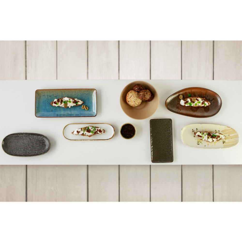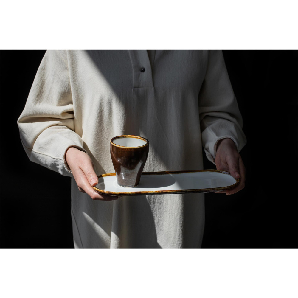 Połączenie dwóch kontrastujących kolorów oraz wysokiego połysku szkliwa daje zachwycający efekt. Mocna forma naczyń i solidna grubość porcelany dodaje tej kolekcji rustykalnego charakteru. Dodatkowy efekt przebarwień i nierównomiernego rozmieszczenia kolorów na zewnętrznej powierzchni naczyń, uzyskany został dzięki specjalnej metodzie wykorzystania szkliwa reaktywnego. W jej wyniku na powierzchni filiżanek, mis, półmisków i talerzy powstają nieregularne dekoracje. Do złudzenia wyglądają jakby powstały w sposób naturalny. Zewnętrzna brązowo-rdzawa barwa przenika delikatnie do wnętrza naczynia i łączy się subtelnie z odcieniem „lodowatej” bieli. Ten niesamowity efekt to połączenie nowoczesności i nawiązanie do tradycyjnych form naczyń. Artystyczne postarzanie porcelany to obecnie bardzo modny trend w wystroju restauracji czy jadalni.