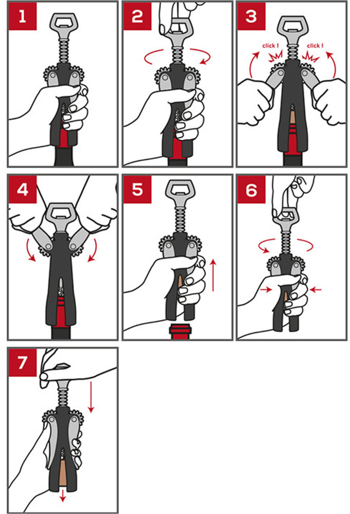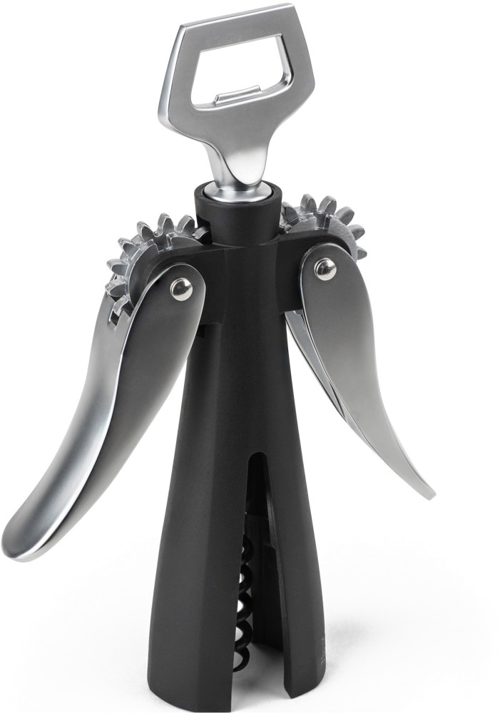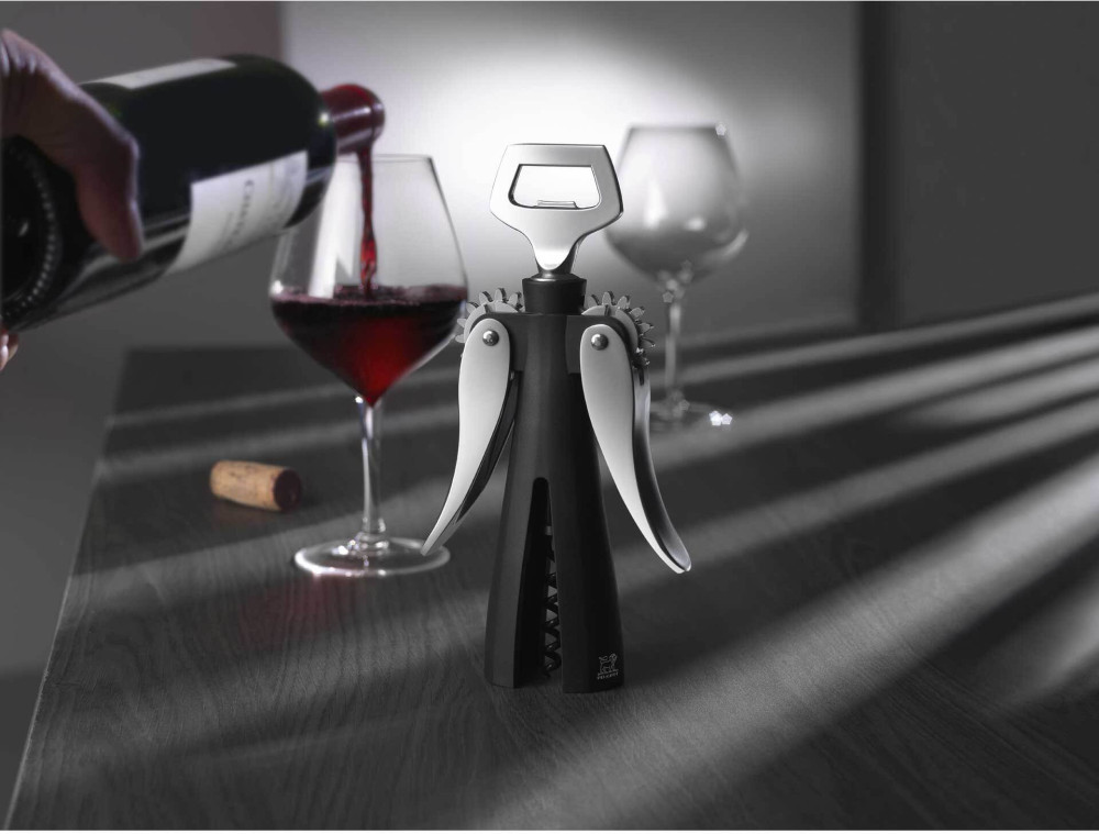 Dzięki opatentowanemu systemowi podwójnej dźwigni, usuniesz korek z butelki niezwykle łatwo i płynnie. Solidna, stalowa, ostro zakończona spirala lekko wbija się w korek i nie wystaje poza obudowę otwieracza. Otwieracz Souverain wyposażony jest również w otwieracz do kapslowanych butelek. Wszystkie elementy otwieracza doskonale komponują się i tworzą dobry design. Stalowe, lekko wygięte dźwignie zakończone efektowną zębatką w połączeniu z trapezowym otwieraczem do kapsli i obudową w kształcie kielicha wprowadza nas w świat designu i skutecznie uruchamia naszą wyobraźnię. A Tobie co przypomina ten otwieracz … ? Połączenie minimalistycznych kolorów szlachetnej czerni bakelitu i stali podkreśla walory wizualne tego otwieracza.