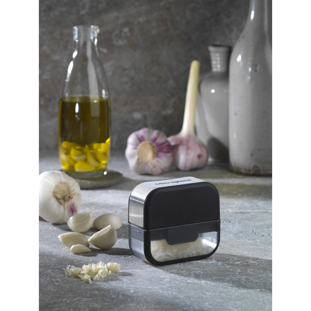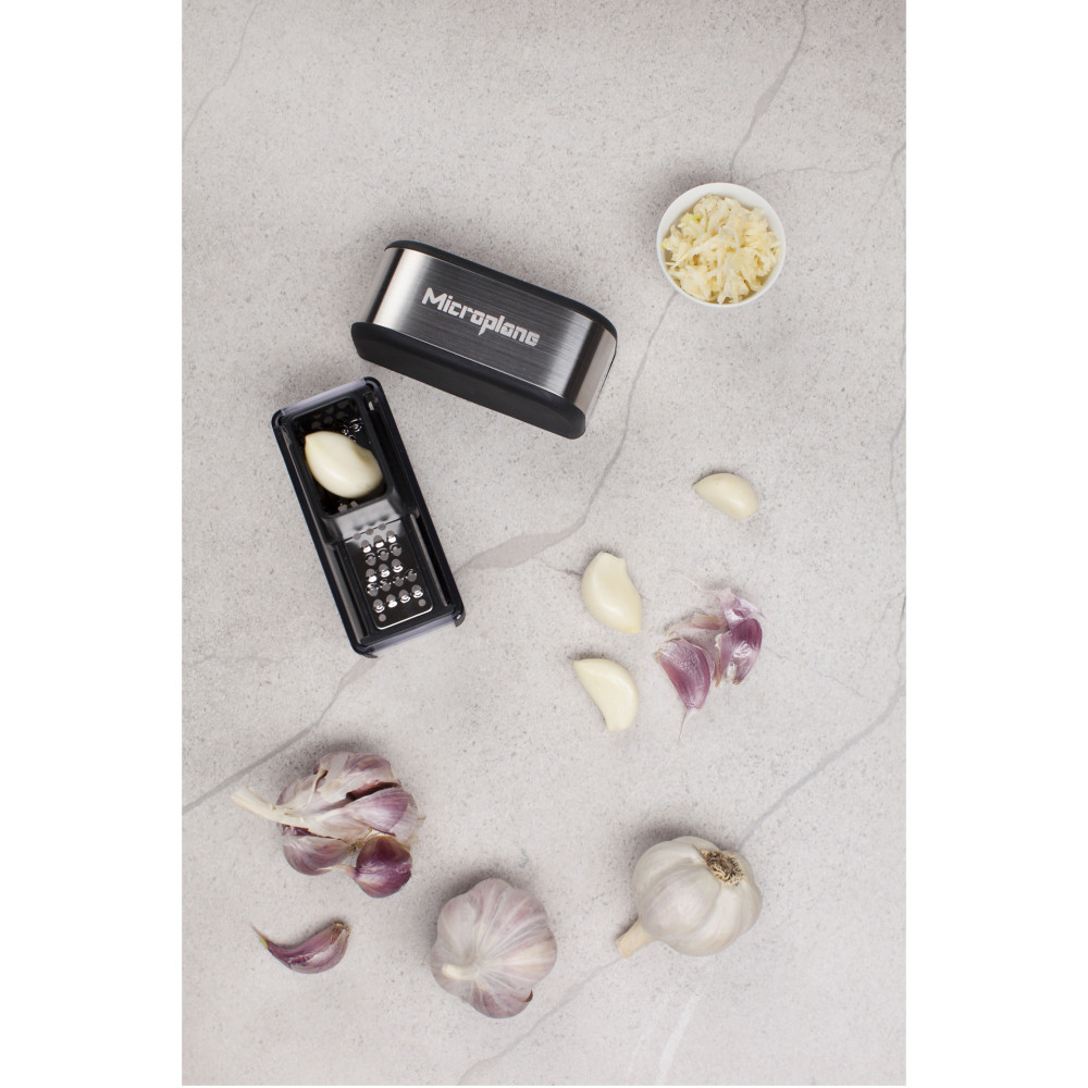 Pomysłowa tarka do czosnku Microplane, to poręczny, kompaktowy i skuteczny gadżet, kuchenny. Tarka ta szybko i sprawnie kroi czosnek na małe, jednolite kawałki zapewniając pełne rozwinięcie się naturalnych olejków i smaków tego warzywa. Obrane ząbki czosnku należy włożyć do pojemniczka, a następnie docisnąć je praską. Prostym ruchem do przodu i do tyłu czosnek ścierany jest bezpośrednio do przezroczystego pojemnika. Dzięki małemu skrobakowi, który znajduje się wewnątrz pokrywki, można sprawnie przełożyć czosnek go do naczynia czy na talerz. Minimalny kontakt czosnku z dłońmi skutecznie sprawi, że ręce będą wolne od zapachu.