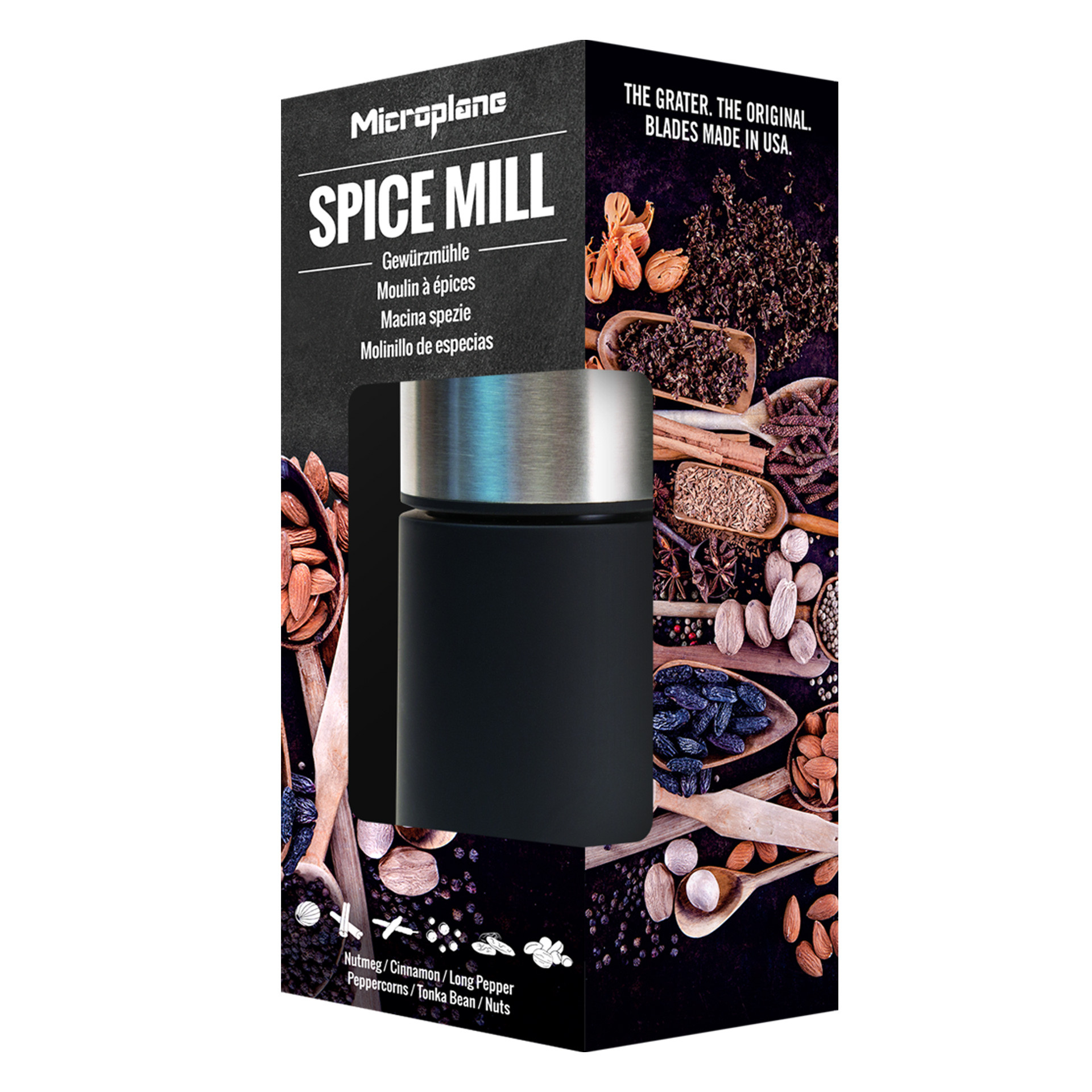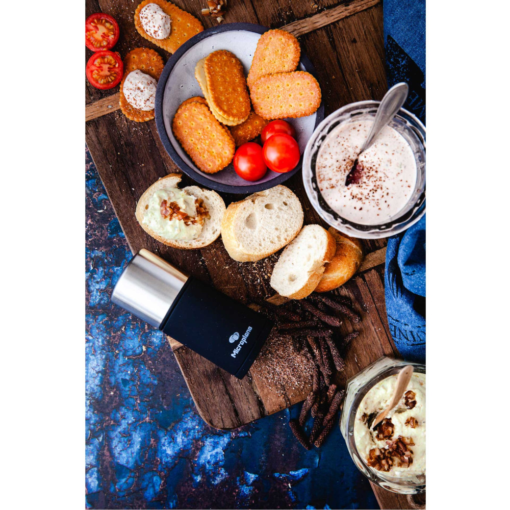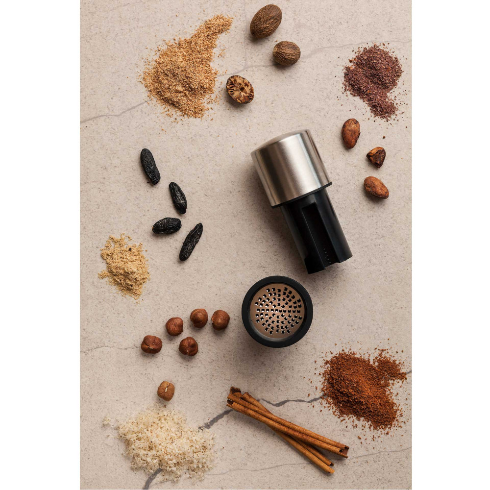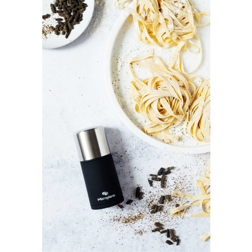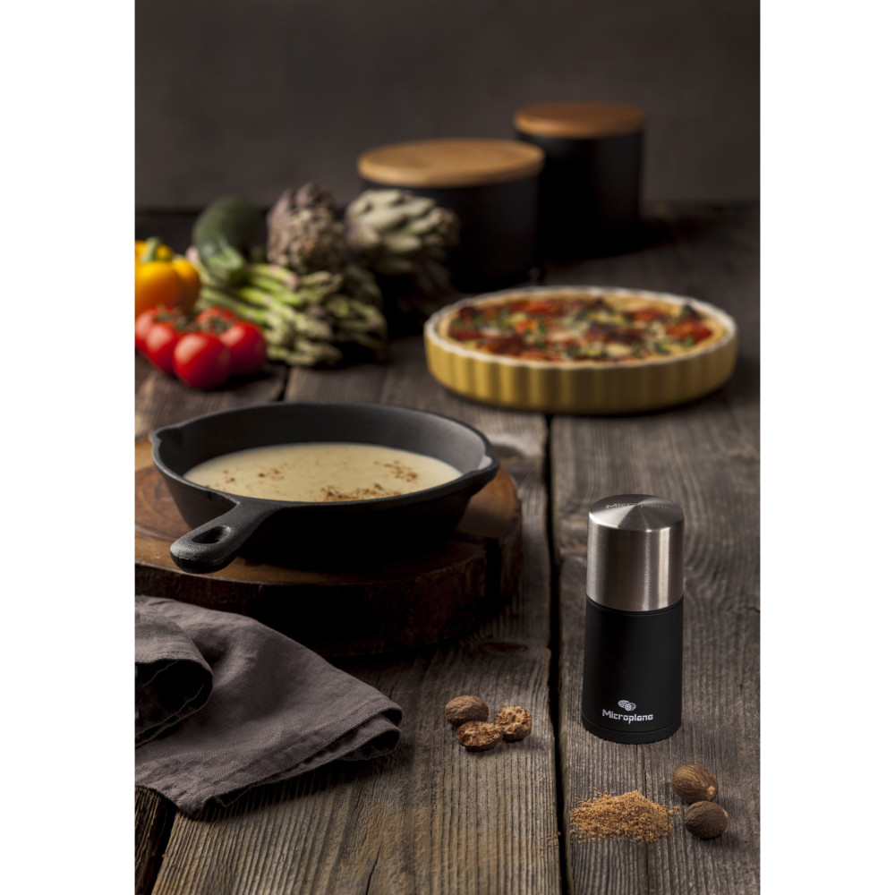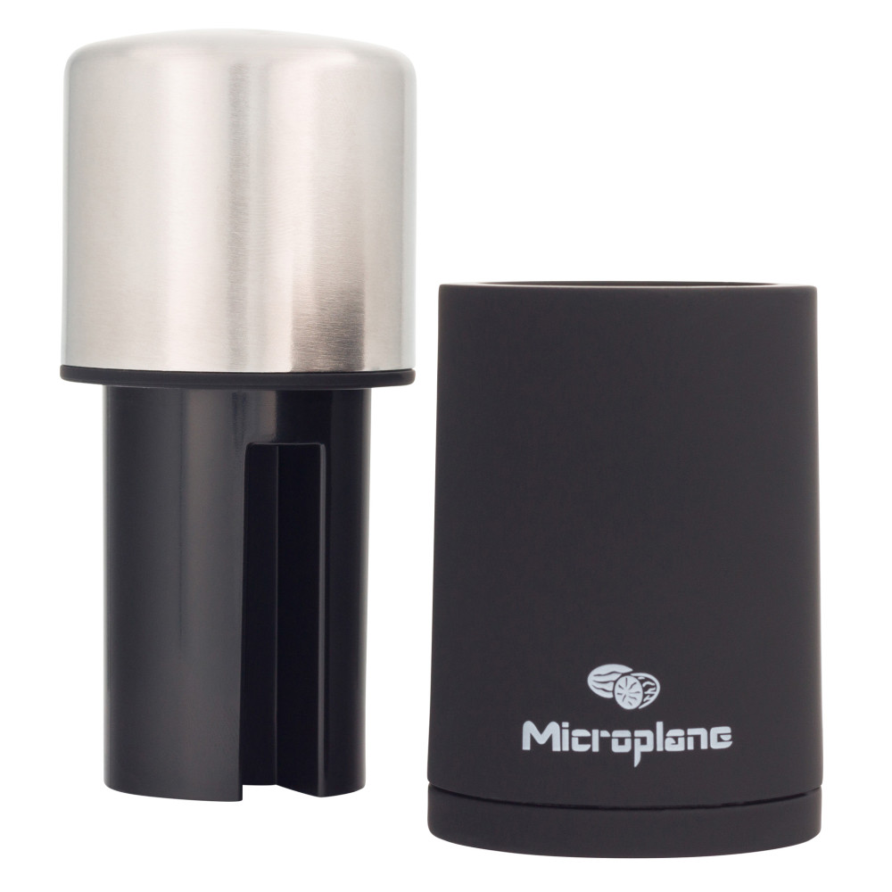 Młynek Microplane zapewnia doskonałe rezultaty mielenia twardych przypraw, również takich, które nie mogą być mielone w tradycyjnych młynkach. Młynek Microplane z powodzeniem zmieli gałkę muszkatołową, korę cynamonu, orzechy, fasolę tonka, długi pieprz, czy ulubioną mieszankę rodzajów pieprzu. Niezwykle precyzyjne ostrze umieszczone jest w podstawie młynka. Młynek jest łatwy w użyciu. Wystarczy zdjąć górną część, umieść przyprawy, następnie nałożyć górną część, docisnąć i przekręcać zgodnie z kierunkiem wskazówek zegara. Przyprawy mogą być przechowywane bezpośrednio w młynku – szczelny dozownik chroni przyprawy przed utratą aromatu i zapachu. Silikonowa osłonka podstawy młynka, pozwala zachować czystość, kiedy młynek nie jest używany – przyprawy nie wydostają się z podstawy młynka, zaśmiecając blat czy stół.