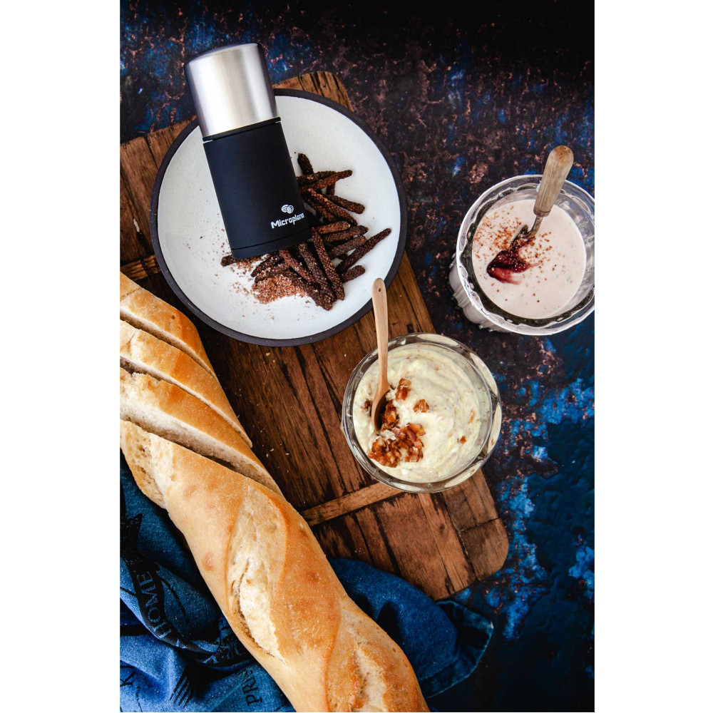 Uznana na całym świecie amerykańska firma Microplane jest producentem z 50-letnim doświadczeniem, który zastosował do produkcji młynka i tarek technologię fototrawienia - innowacyjny proces zaprojektowany specjalnie do tworzenia ultra-ostrych krawędzi tnących. Maleńkie zęby zachowują się jak niezwykle ostre noże do precyzyjnego krojenia składników. Nie rozdzierają i nie zgniatają produktów jak większość dostępnych na rynku „tarek tłoczonych”. Te specjalistyczne ostrza sprawiają, że jedzenie nie przykleja się ani nie blokuje, ale delikatnie przesuwa się po powierzchni cięcia, zapewniając doskonałe rezultaty ścierania na drobne wiórki i nitki, a produkty wilgotne na miazgę.