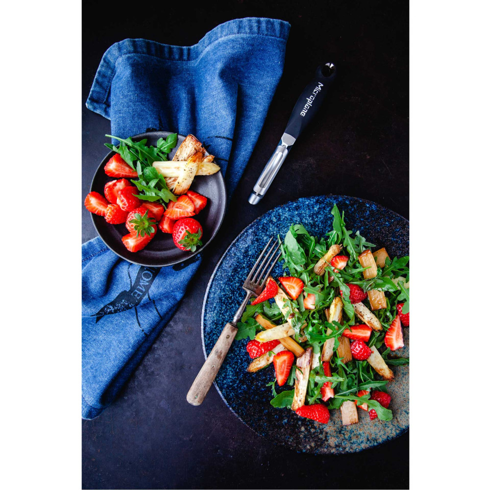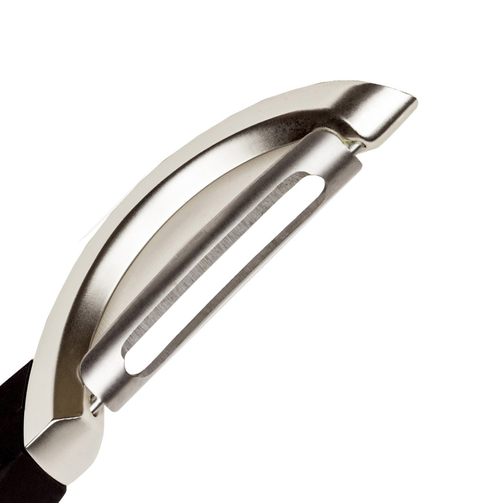 Obieraczka do warzyw i owoców to prawdziwy niezbędnik w każdej kuchni. Ta profesjonalna obieraczka ma wbudowane ostrze do oczkowania ziemniaków. Oprócz precyzyjnego obierania warzyw i owoców, może posłużyć również do ścierania cienkich pasków owoców i warzyw, idealnych do sałatek i do dekoracji. Podwójne ostrze ze stali nierdzewnej obraca się o 30 °, aby fachowo konturować miękkie i twarde owoce, a także długie i okrągłe warzywa, takie jak marchew, rzepa, cukinia, ziemniaki, pasternak, mango, jabłka, a nawet kabaczek. Obieraczka jest nieco cięższa od innych, co daje funkcję idealnego wywarzenia i wygodnego trzymania jej w dłoni. Ostrza można przesuwać w dwóch kierunkach: tam i z powrotem, przy niewielkim nacisku. Ergonomiczny uchwyt „soft touch” przystosowany jest zarówno dla osób praworęcznych jak i leworęcznych, umożliwiając kciukowi i palcowi wskazującemu znalezienie optymalnej pozycji do wygodnej pracy.
