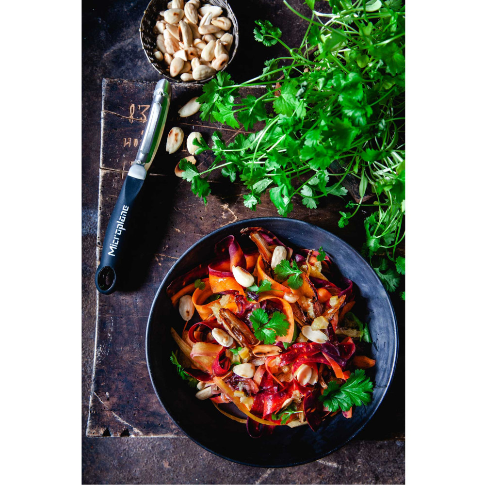 Uznana na całym świecie amerykańska firma Microplane jest producentem z 50-letnim doświadczeniem, który zastosował do produkcji młynka i tarek technologię fototrawienia - innowacyjny proces zaprojektowany specjalnie do tworzenia ultra-ostrych krawędzi tnących. Maleńkie zęby zachowują się jak niezwykle ostre noże do precyzyjnego krojenia składników. Nie rozdzierają i nie zgniatają produktów jak większość dostępnych na rynku „tarek tłoczonych”. Te specjalistyczne ostrza sprawiają, że jedzenie nie przykleja się ani nie blokuje, ale delikatnie przesuwa się po powierzchni cięcia, zapewniając doskonałe rezultaty ścierania na drobne wiórki i nitki, a produkty wilgotne na miazgę.