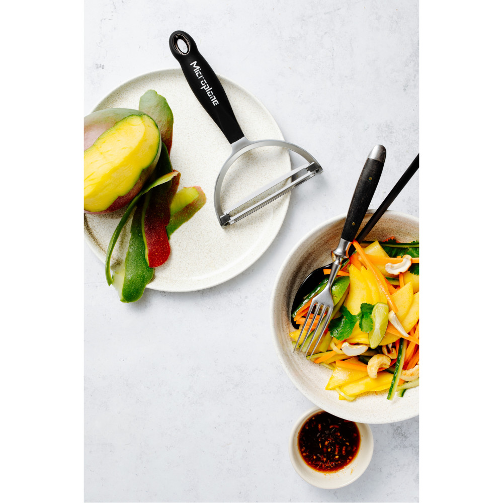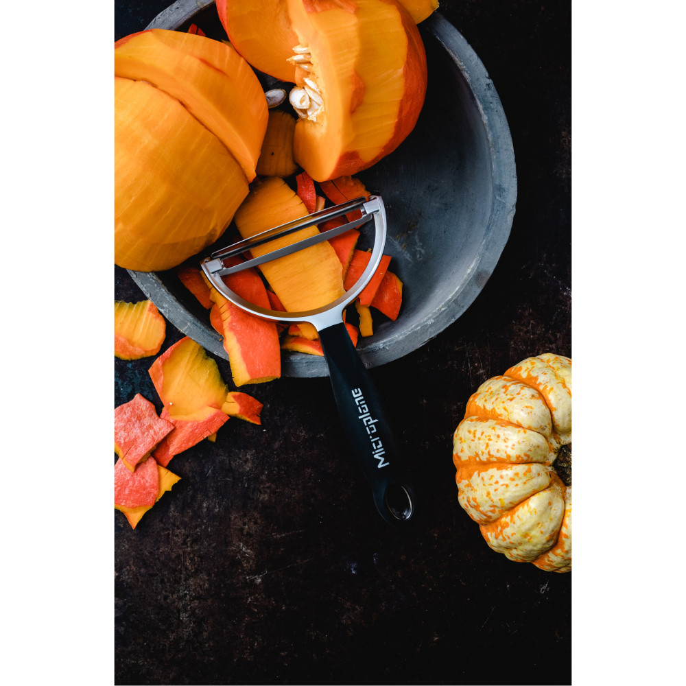 Obieraczka XL do warzyw i owoców marki Microplane to doskonały wybór dla każdego kucharza, zarówno profesjonalisty, jak i amatora, który ceni sobie wygodę i efektywność podczas przygotowywania posiłków. Idealna do większych owoców i warzyw z grubszą skórką, takich jak dynia, bataty, papaja i melony. Sprawdzi się również do szatkowania kapusty, sałaty lub sera. Swobodnie obracające się ostrze pozwala na łatwe dopasowanie do kształtu obieranego produktu. Ergonomiczny uchwyt „soft touch” z otworem do zawieszenia zapewnia komfortowy chwyt, co ułatwia obieranie bez zmęczenia dłoni, nawet przy dłuższym użytkowaniu.