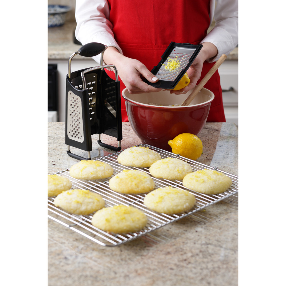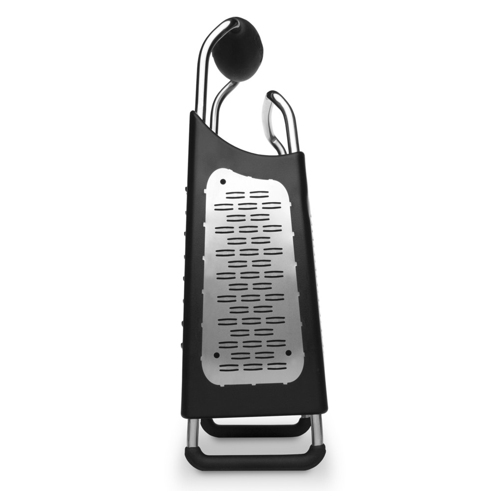Innowacyjna, czterostronna tarka z trzema różnymi powierzchniami ściernymi oraz ostrzem do krojenia plastrów z pewnością stanie się Twoim niezastąpionym w kuchni narzędziem. Solidna rama ze stali nierdzewnej, antypoślizgowy uchwyt i gumowe stopki gwarantują stabilność podczas tarcia i zapewniają maksymalny komfort pracy. Ścianka, na której znajduje się drobne ostrze, jest wyjmowana, co ułatwia dokładne umycie tarki od wewnątrz.