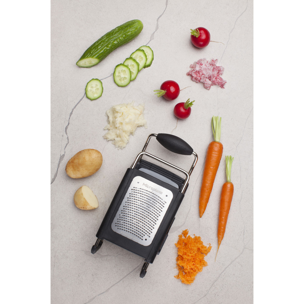 Uznana na całym świecie amerykańska firma Microplane jest producentem z 50-letnim doświadczeniem, który zastosował do produkcji młynka i tarek technologię fototrawienia - innowacyjny proces zaprojektowany specjalnie do tworzenia ultra-ostrych krawędzi tnących. Maleńkie zęby zachowują się jak niezwykle ostre noże do precyzyjnego krojenia składników. Nie rozdzierają i nie zgniatają produktów jak większość dostępnych na rynku „tarek tłoczonych”. Te specjalistyczne ostrza sprawiają, że jedzenie nie przykleja się ani nie blokuje, ale delikatnie przesuwa się po powierzchni cięcia, zapewniając doskonałe rezultaty ścierania na drobne wiórki i nitki, a produkty wilgotne na miazgę.