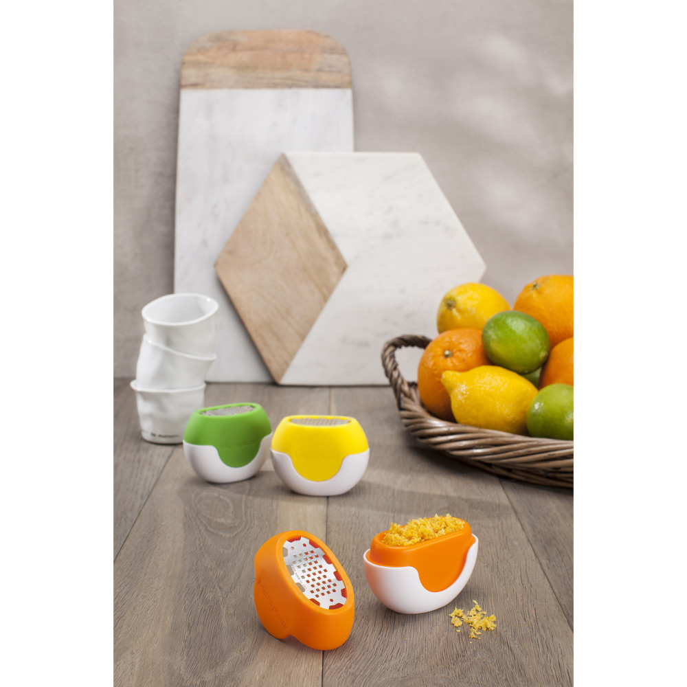 Tarka Flexi Zesti™ to doskonałe narzędzie do szybkiego, łatwego i skutecznego ścierania skórki cytrusów. Kompaktowa, ergonomiczna tarka idealnie mieści się w dłoni. Dzięki bardzo ostremu, cienkiemu ostrzu z łatwością ściera wierzchnią warstwę skórki cytrusów, nie zbierając białego, gorzkiego miąższu. Jej kształt dostosowany jest do kształtu dłoni, co ułatwia ścieranie. Ścierana skórka kumuluje się w pojemniku tuż pod ostrzem. Aby sprawnie dozować ten wspaniały, aromatyczny produkt, wystarczy zdjąć silikonową obudowę z ostrzem. Świeżo starte cytrusy gwarantują naturalny, pełen aromatu smak deserów i innych potraw.