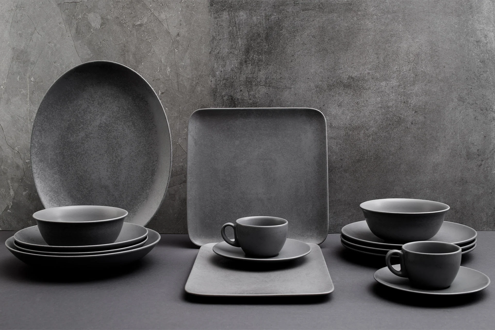 Linie SHALE i KARBON można dowolnie łączyć, komponując zastawę w surowych kolorach czerni i szarości.