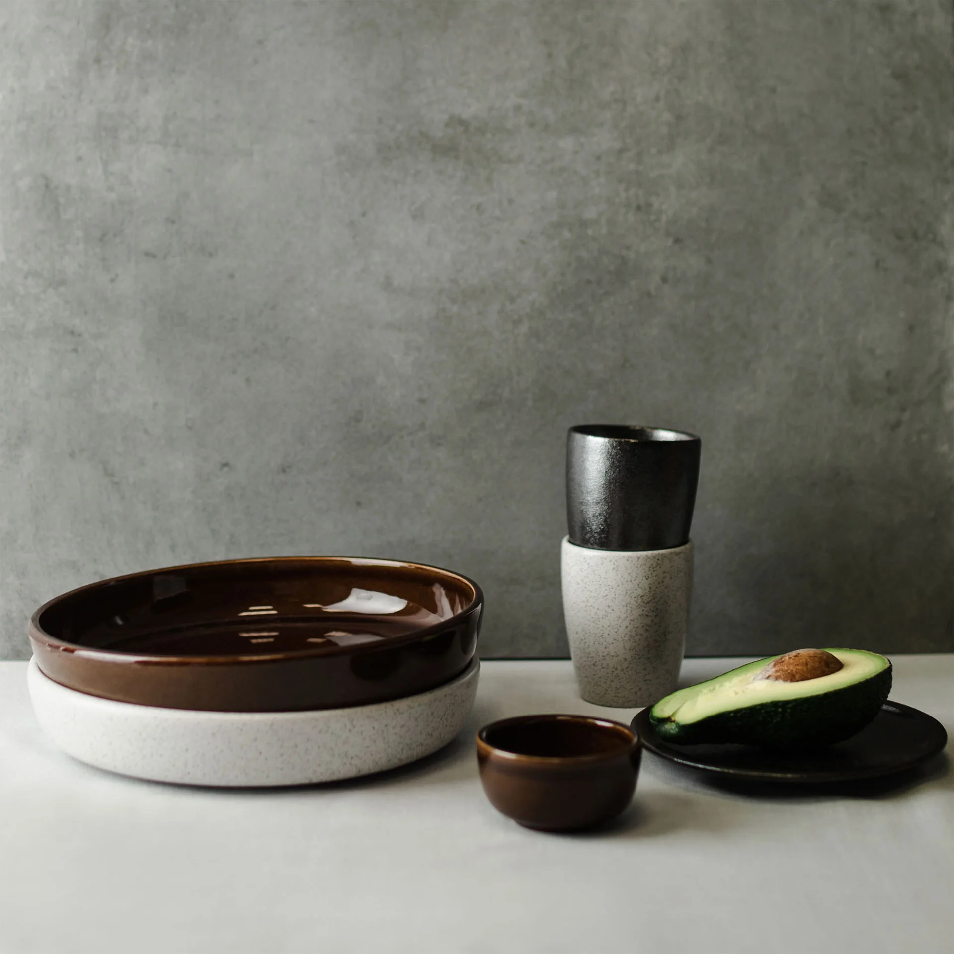 Elementy porcelany RAKSTONE dostępne są w czterech wariantach kolorystycznych: białym, wulkanicznym, kobaltowym oraz bursztynowym.