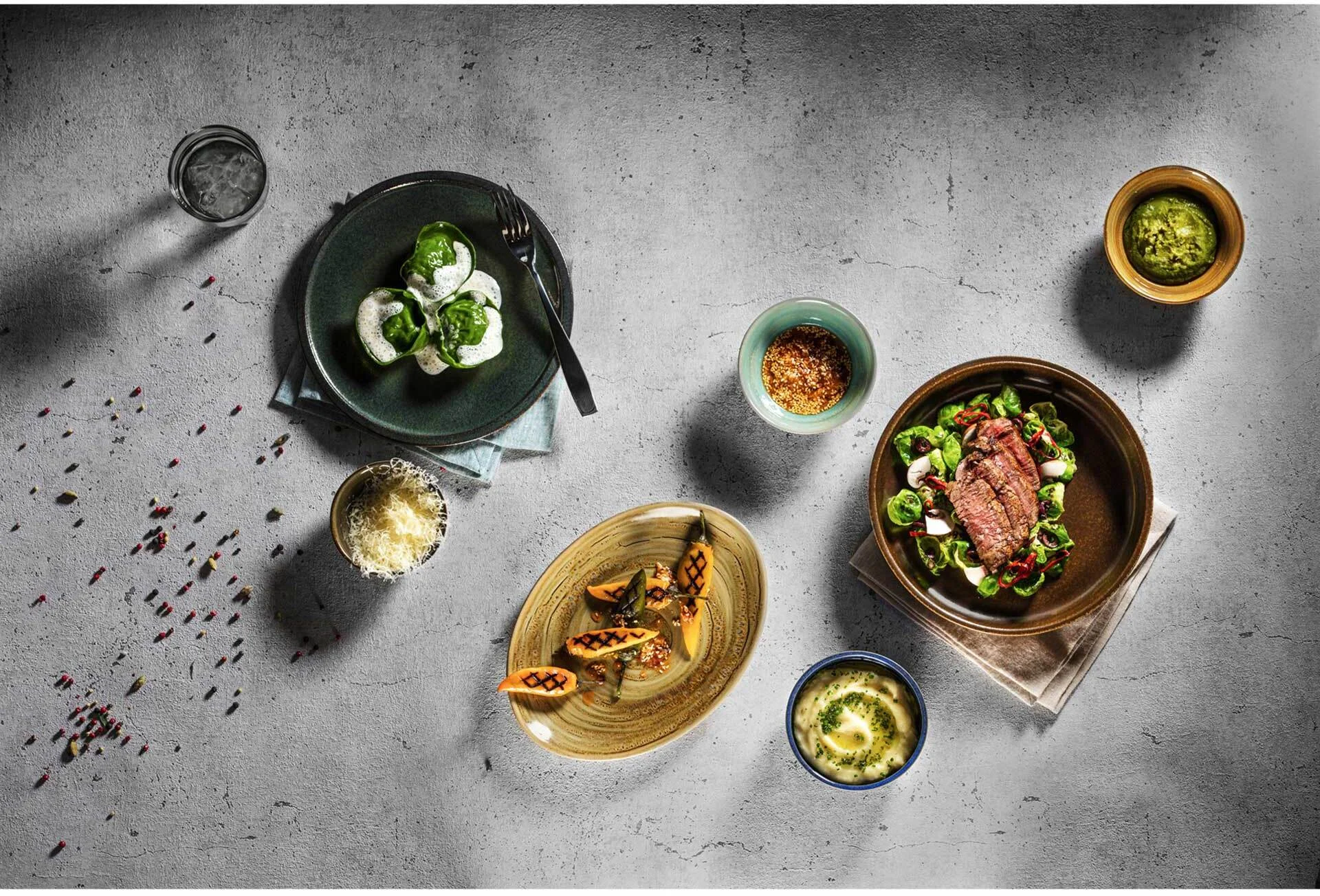 Elementy porcelany RAKSTONE dostępne są w czterech wariantach kolorystycznych: białym, wulkanicznym, kobaltowym oraz bursztynowym.