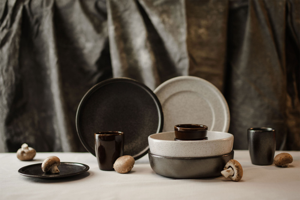 Elementy porcelany EASE dostępne są w czterech wariantach kolorystycznych: białym, wulkanicznym, kobaltowym oraz bursztynowym.