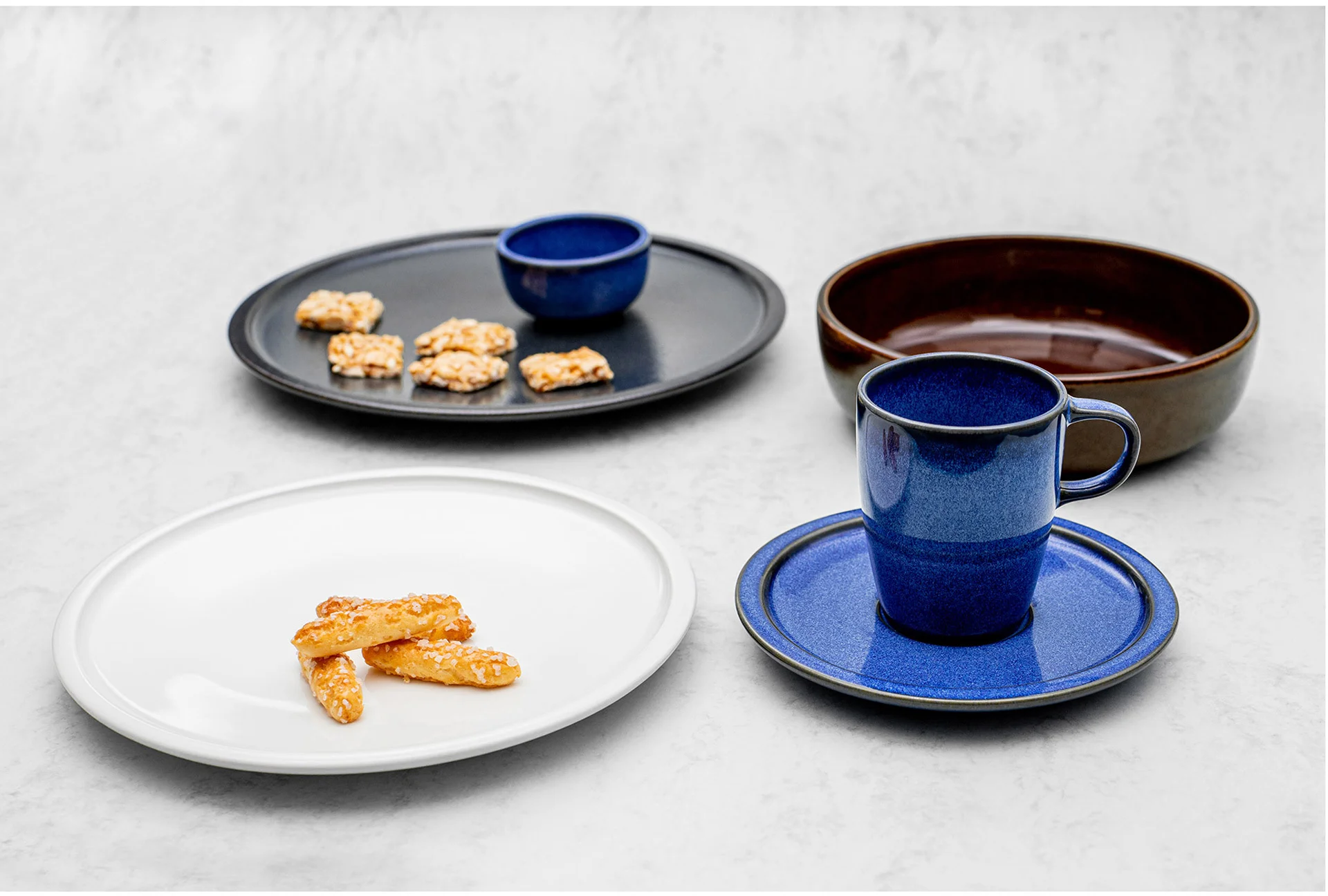 Elementy porcelany RAKSTONE dostępne są w czterech wariantach kolorystycznych: białym, wulkanicznym, kobaltowym oraz bursztynowym.