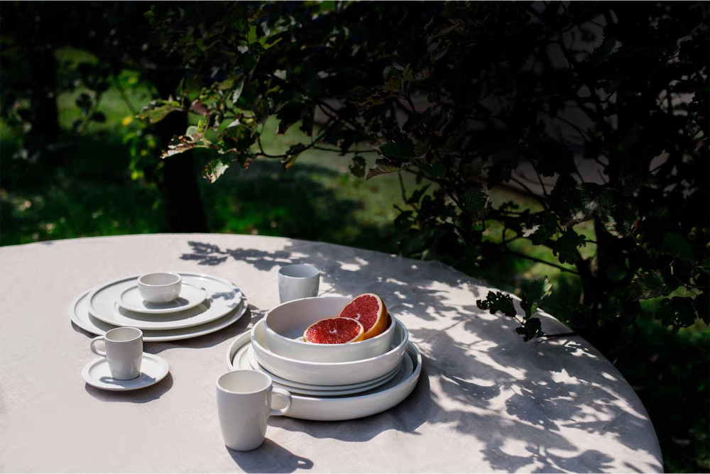 Elementy porcelany RAKSTONE dostępne są w czterech wariantach kolorystycznych: białym, wulkanicznym, kobaltowym oraz bursztynowym.