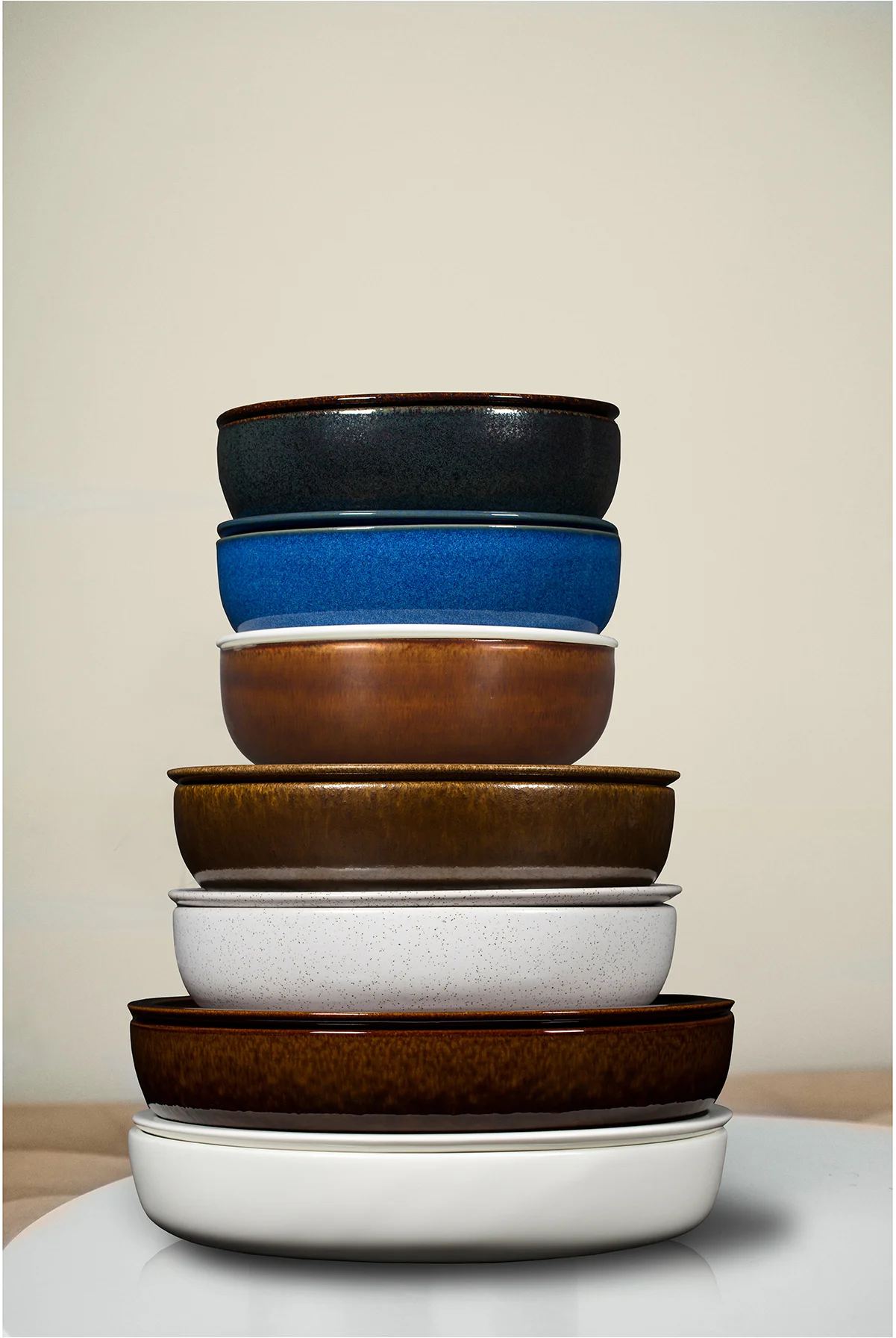 Elementy porcelany RAKSTONE dostępne są w czterech wariantach kolorystycznych: białym, wulkanicznym, kobaltowym oraz bursztynowym.