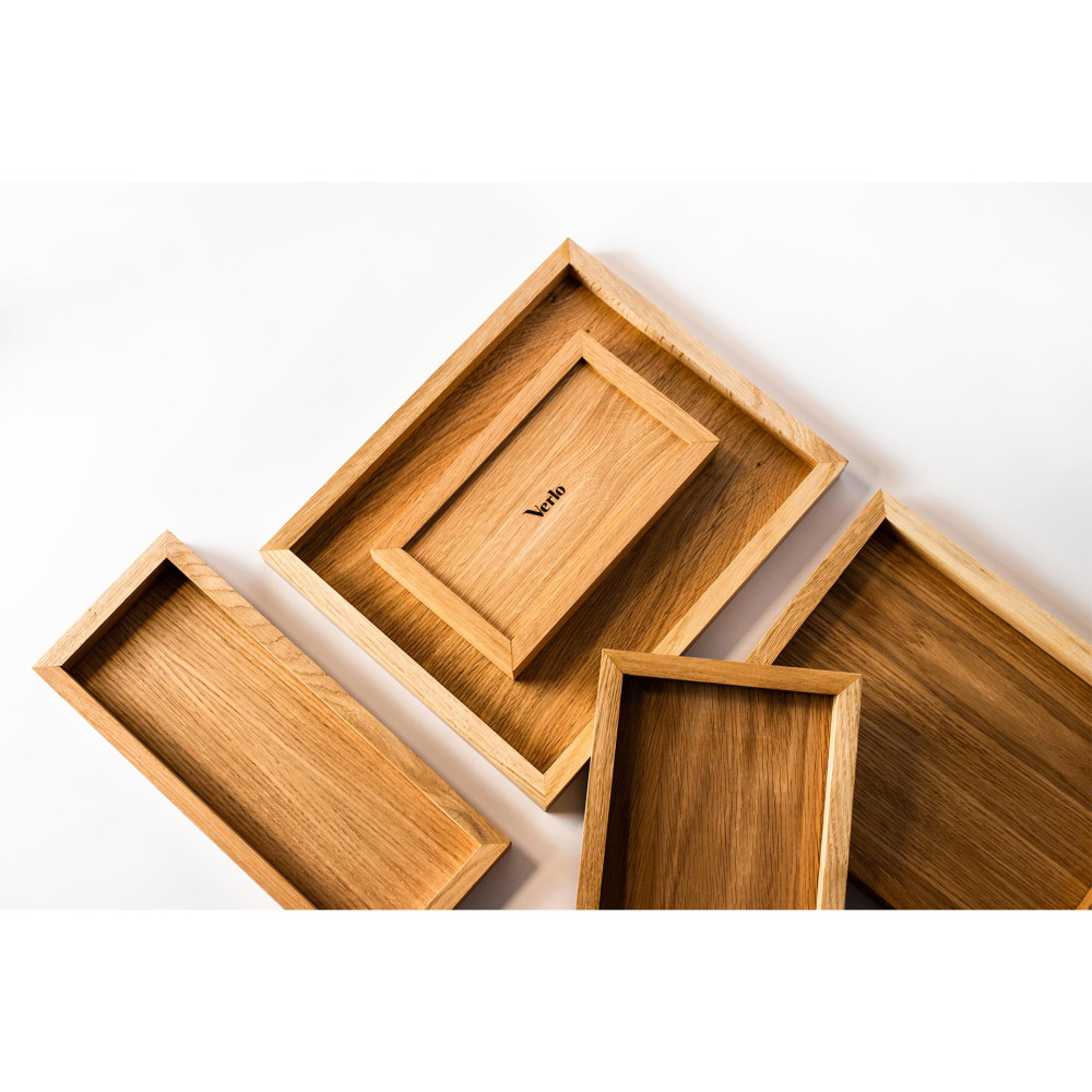 Taca dębowa STRATOS VERLO to efektowny i praktyczny sposób na podawanie śniadań, dań i napojów. To nietuzinkowy i bardzo nowoczesny sposób na serwowanie jedzenia zarówno w domu jak i w hotelach czy podczas większych bankietów, prezentując na nich np. dania fingerfood. Podwyższone ranty, oprócz walorów wizualnych, zabezpieczą przed zsuwaniem się jedzenia lub napojów.