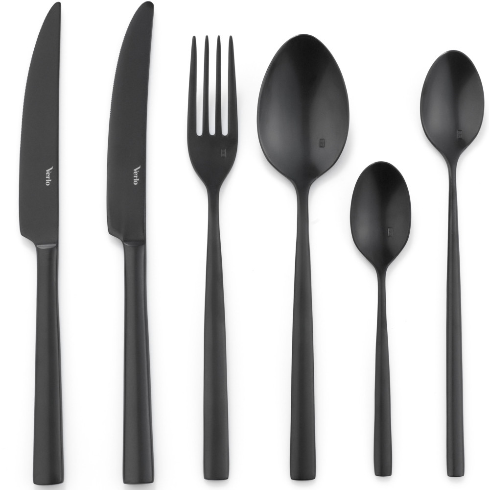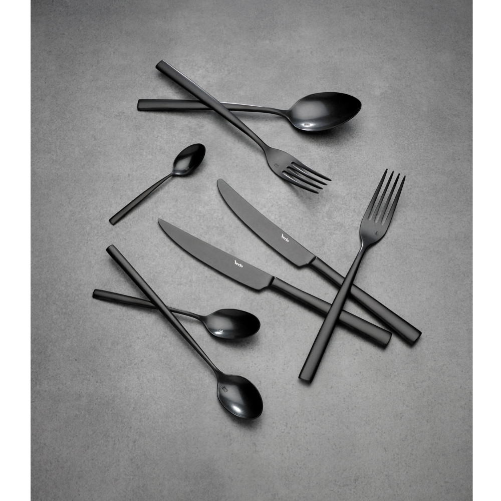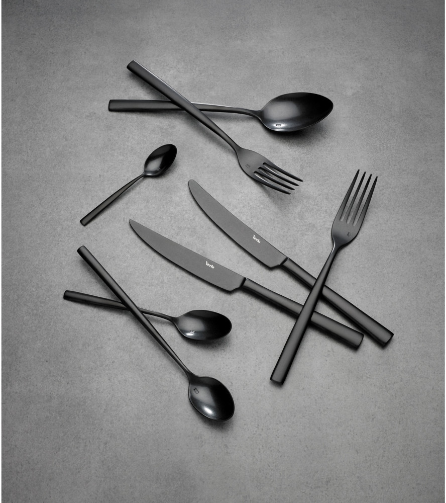 SU BLACK. Nowoczesne, wyjątkowe, minimalistyczne sztućce z matowym wykończeniem w kolorze modnej czerni. Ta kolekcja zachwyca swym minimalistycznym designem. Idealnie wyważona! Wyraźnie zarysowana linia ostrza, długie widelce i płynne połączenie górnej części z trzonkami nadaje tej kolekcji wizualnej lekkości. Widoczny grawer na części użytkowej, z symbolem rodzaju stali, zachwyca szykownym efektem wizualnym. Wyjątkowa linia pasująca do wnętrz w nowoczesnym stylu.