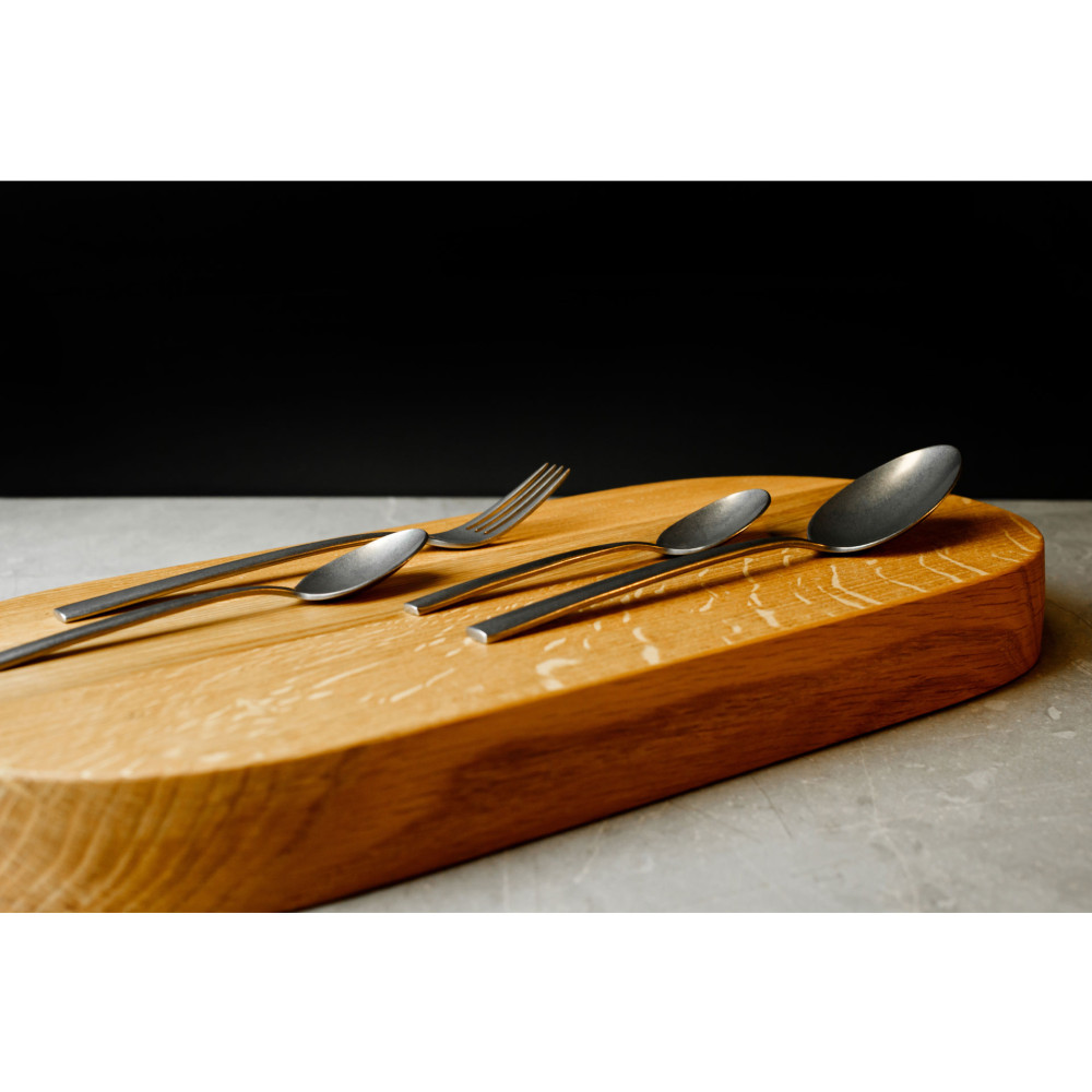 SU ANTIQUE. Jeśli doceniasz prostotę z nutką ekstrawagancji, to ta kolekcja jest dla Ciebie. Idealnie wyważona, wyraźnie zarysowane, ostre, długie widelce i płynne połączenie górnej części z trzonkami, nadaje tej kolekcji wizualnej lekkości. Widoczny grawer na części użytkowej z symbolem rodzaju stali, zachwyca szykownym efektem wizualnym. Wyraźnie wyodrębniona od trzonka noża, duża powierzchnia tnąca, zapewnia komfort jedzenia. Matowe wykończenie sztućców z efektem postarzałej stali to zdecydowana cecha nadająca Twoim wnętrzom nowatorskiego stylu.