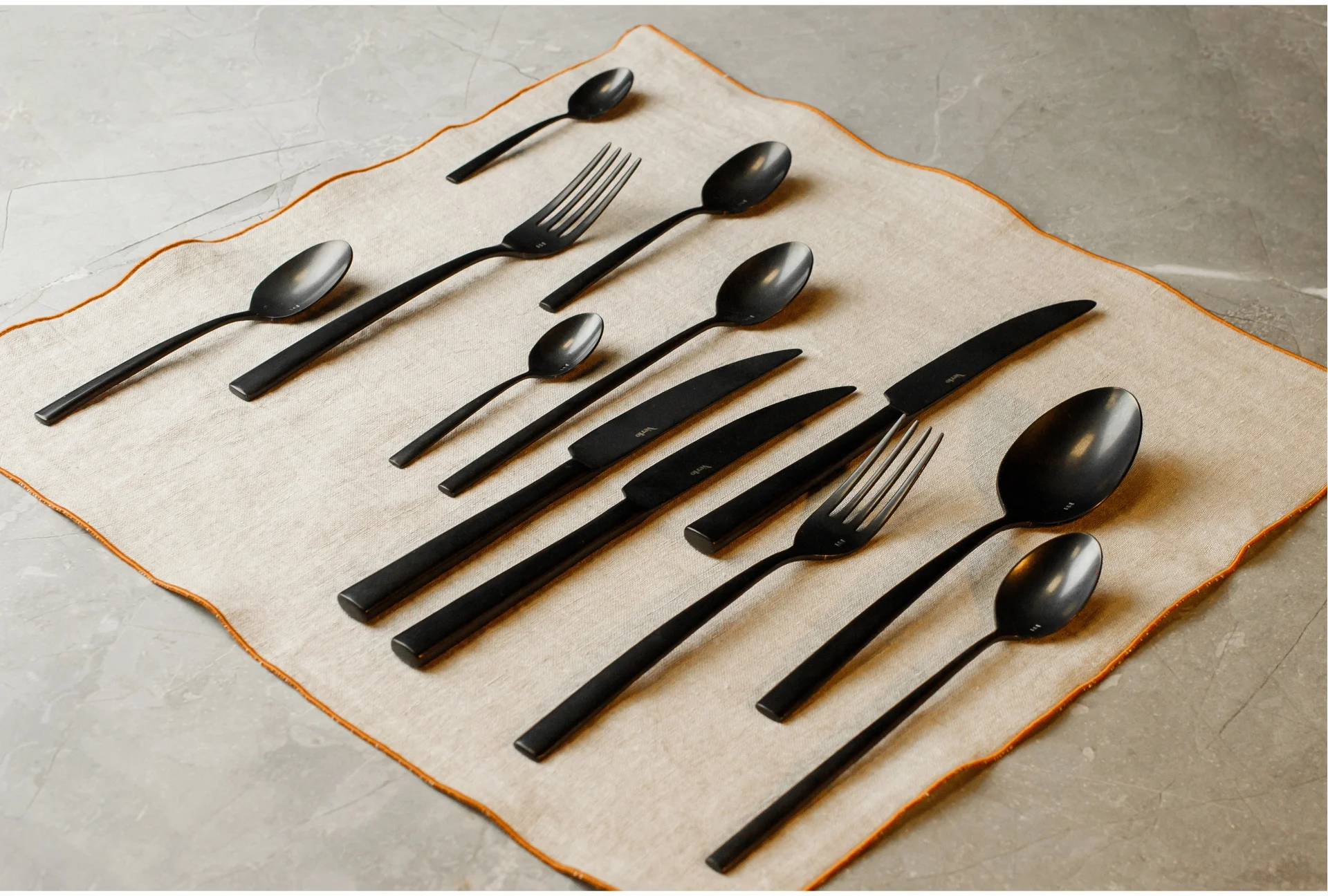SU BLACK. Nowoczesne, wyjątkowe, minimalistyczne sztućce z matowym wykończeniem w kolorze modnej czerni. Ta kolekcja zachwyca swym minimalistycznym designem. Idealnie wyważona! Wyraźnie zarysowana linia ostrza, długie widelce i płynne połączenie górnej części z trzonkami nadaje tej kolekcji wizualnej lekkości. Widoczny grawer na części użytkowej, z symbolem rodzaju stali, zachwyca szykownym efektem wizualnym. Wyjątkowa linia pasująca do wnętrz w nowoczesnym stylu.