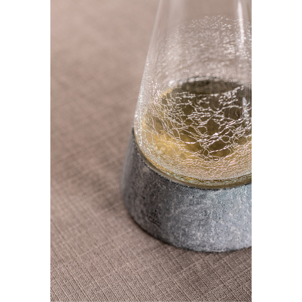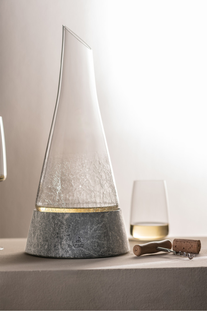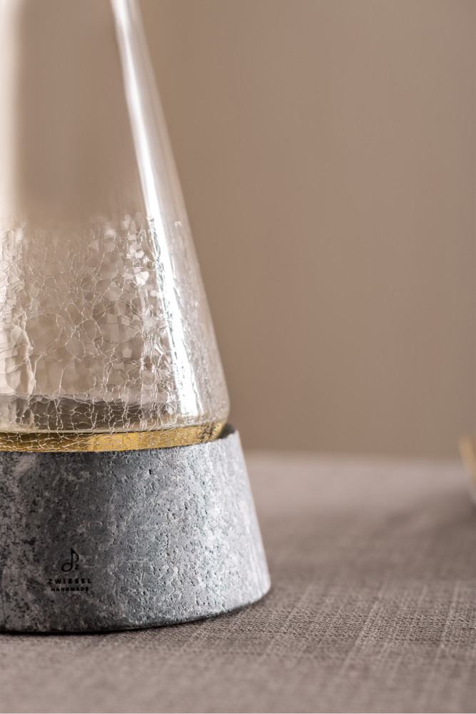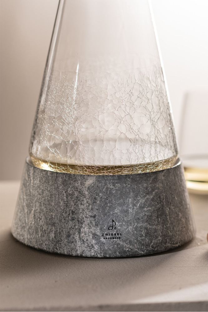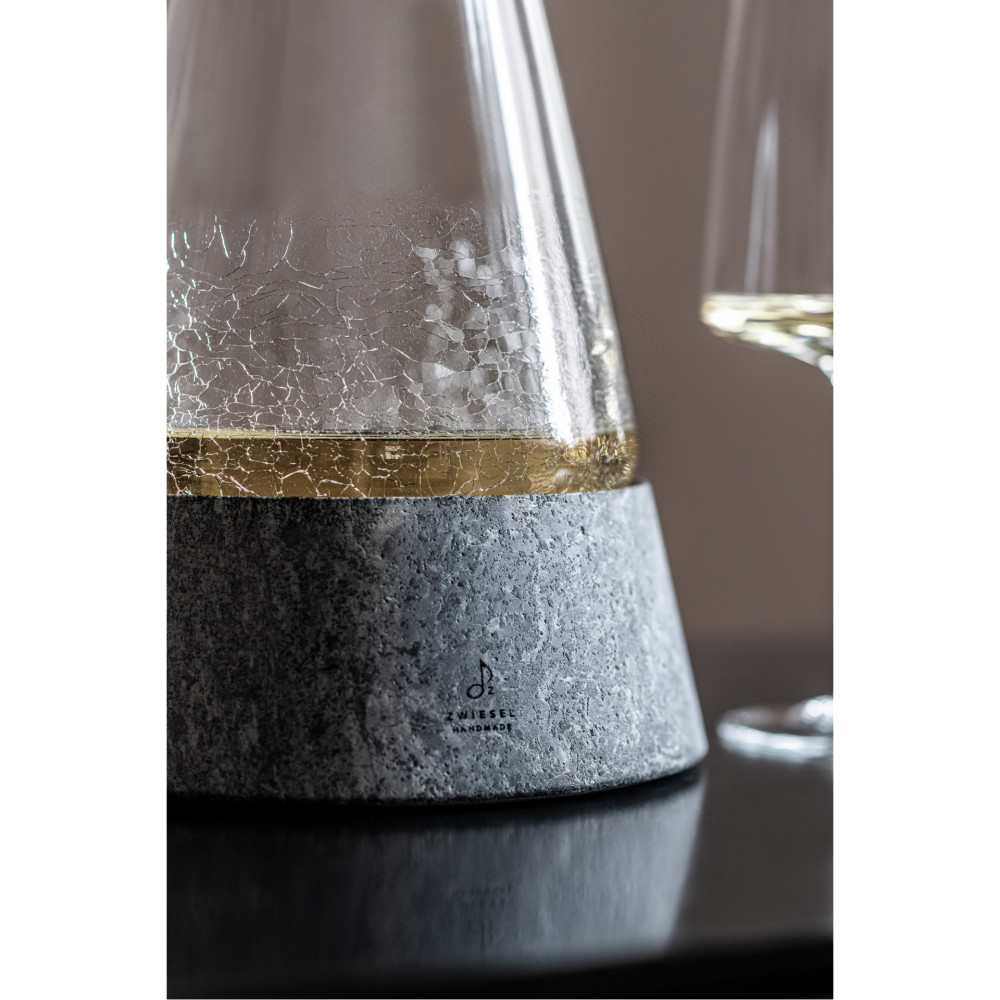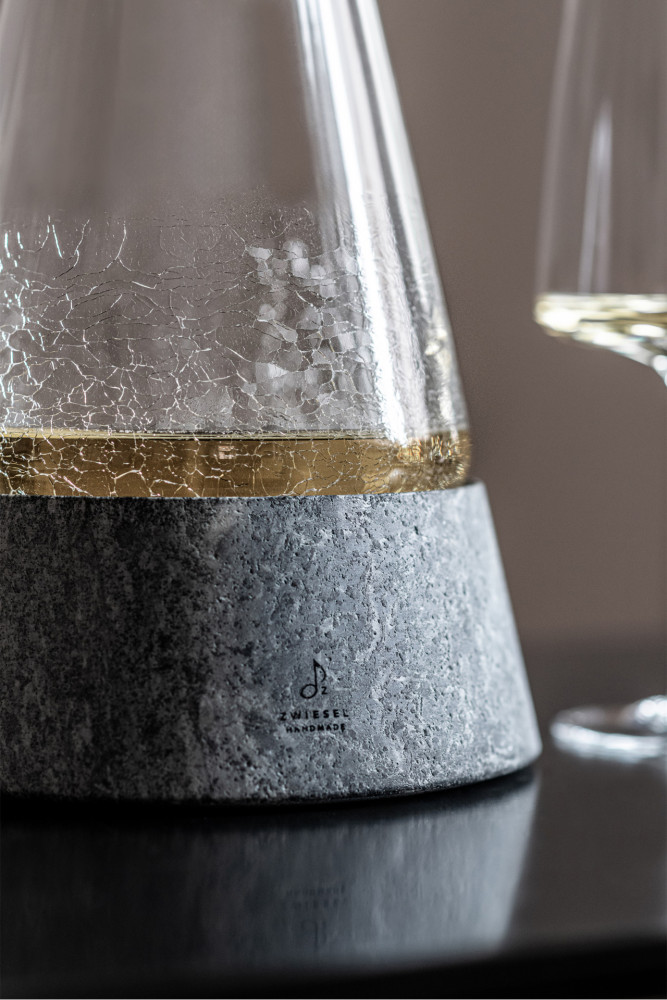 Połączenie natury i designu. Dekanter SYMBIOSIS marki Zwiesel Handmade to wyjątkowe połączenie archaicznych aspektów natury z delikatnym kryształowym szkłem i eleganckim kamieniem. Pokryty delikatną spękaną fakturą, dekanter emanuje subtelną elegancją i delikatnością, która przyciąga wzrok i zachwyca swoim wyglądem.