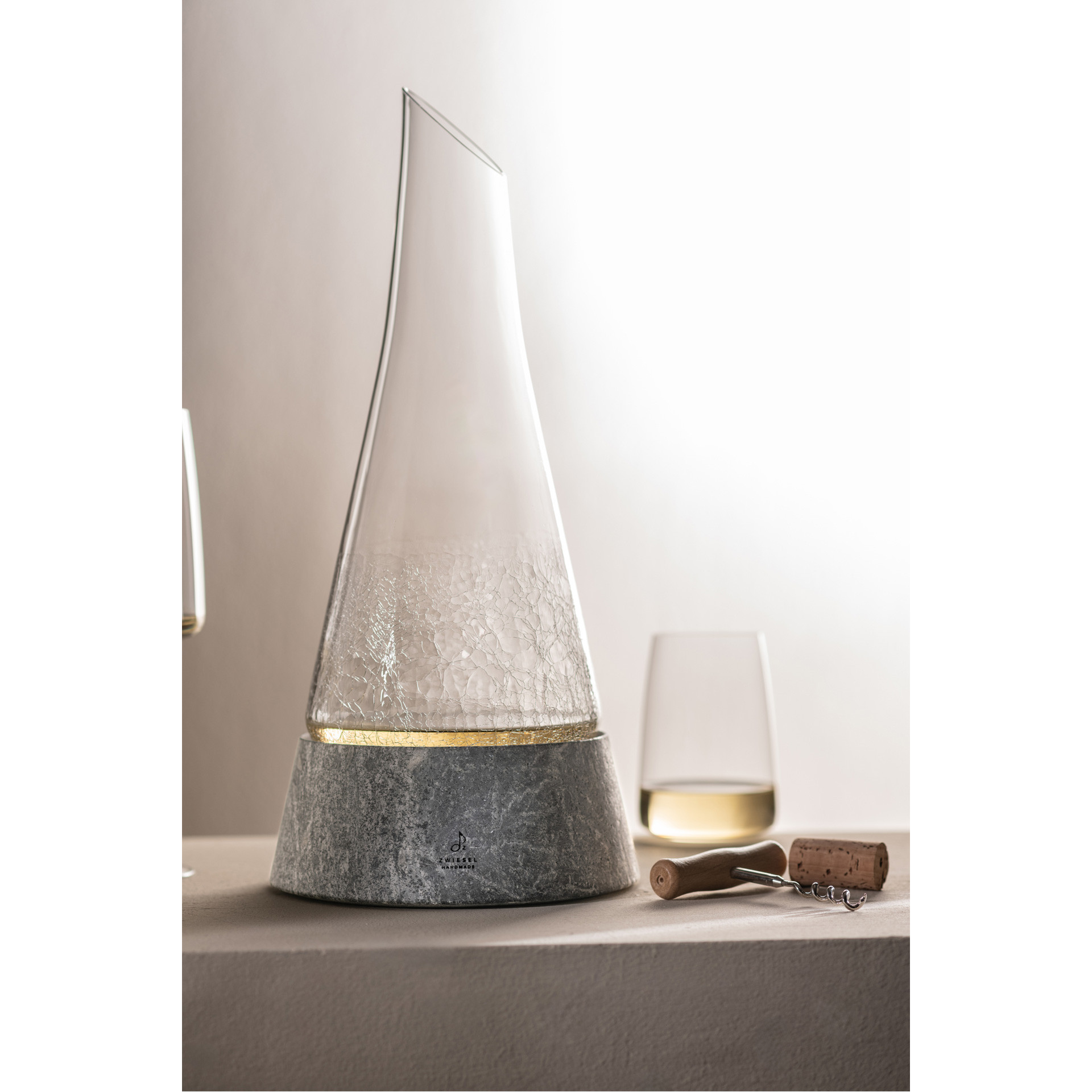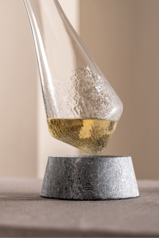 Ręczne wykonanie i ekskluzywność. Każdy element dekantera i podstawy jest ręcznie wykonany, tworząc unikalny i ekskluzywny przedmiot. Dekanter jest wytwarzany w małych ilościach przez mistrzów szklarstwa Zwiesel, co gwarantuje najwyższą jakość i precyzję wykonania. Podstawa z kamienia (steatyt) jest wydobywana i obrabiana w Finlandii, łącząc tradycyjne rzemiosło z nowoczesnym designem.