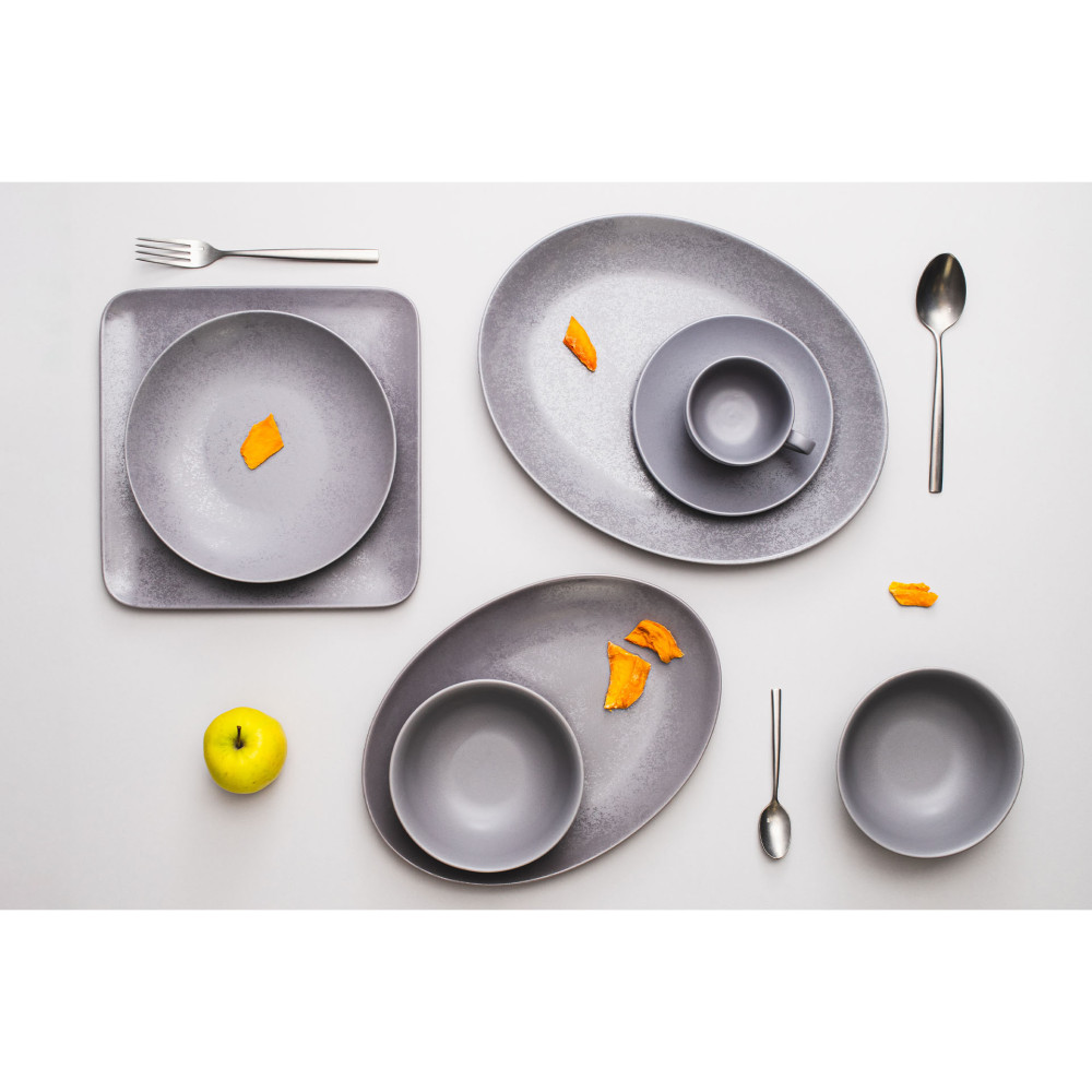RAK SHALE nawiązuje do kolorystyki łupka ilastego. Glazura naczyń z tej kolekcji jest matowo szara, mieniąca się nieregularnymi, połyskującymi plamkami. Powierzchnia, chociaż surowa w swym design-ie, ma satynowe wykończona, a więc mycie naczyń jest bardzo łatwe. Brak płaskich rantów w talerzach daje duże możliwości twórcy dania w jego prezentacji. Możesz serwować swoje menu na talerzach kwadratowych, prostokątnych, okrągłych i owalnych.