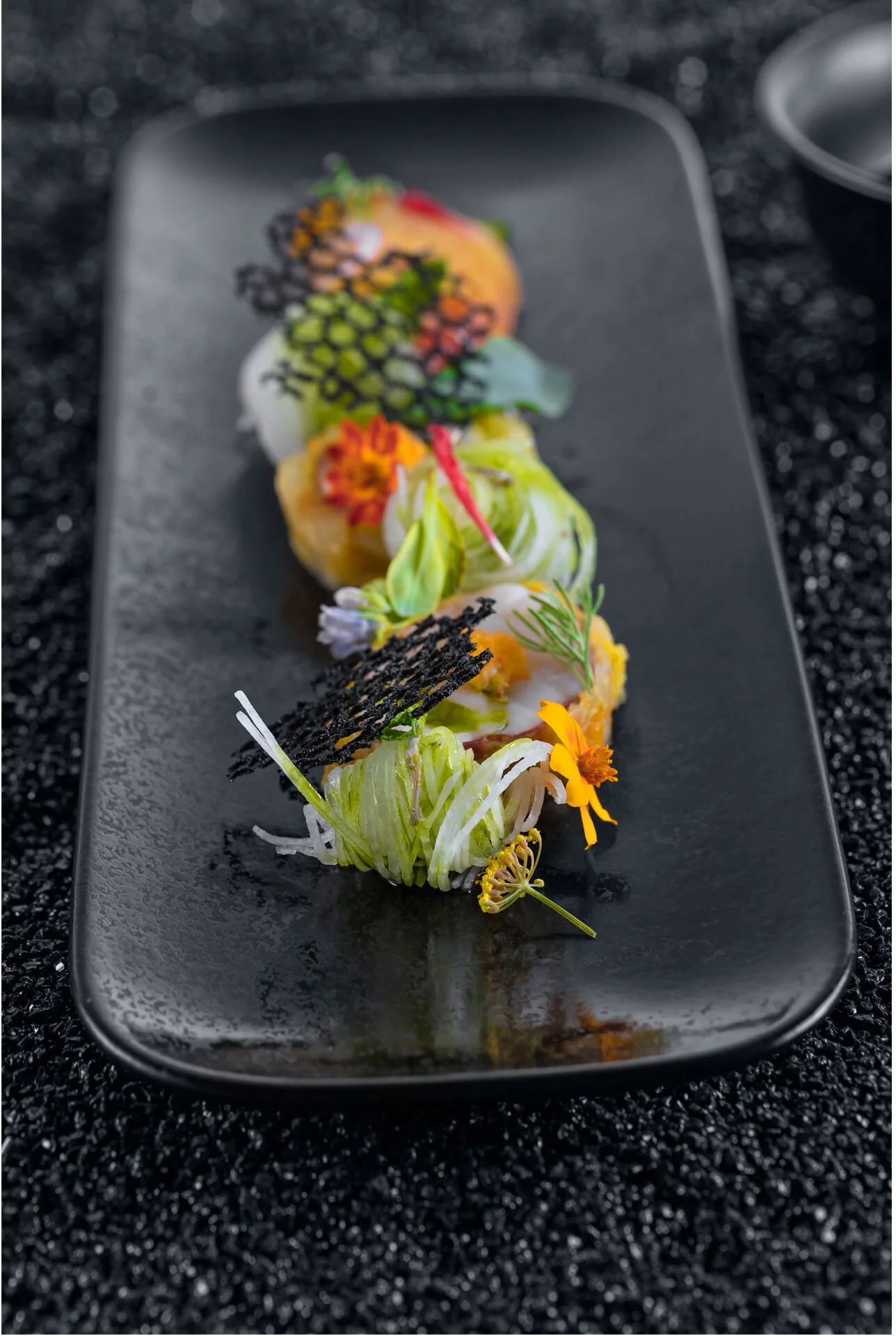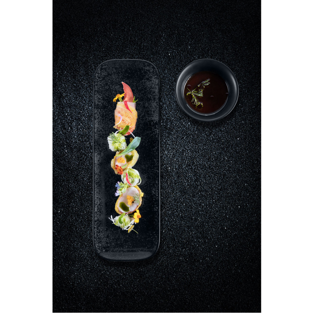Linia KARBON nawiązuje do wyobrażeń o powstaniu świata, kiedy czarna materia zroszona kryształkami i pyłem węgielnym, wypełniała nicość. Matowa glazura, mieniąca się szklistym pyłem, inspirowana jest strukturą naturalnego węgla kamiennego. Łagodne, minimalistyczne formy talerzy i naczyń są idealnym tłem dla głębokiej czerni szkliwa, by jako całość idealnie eskponować każde serwowane danie.