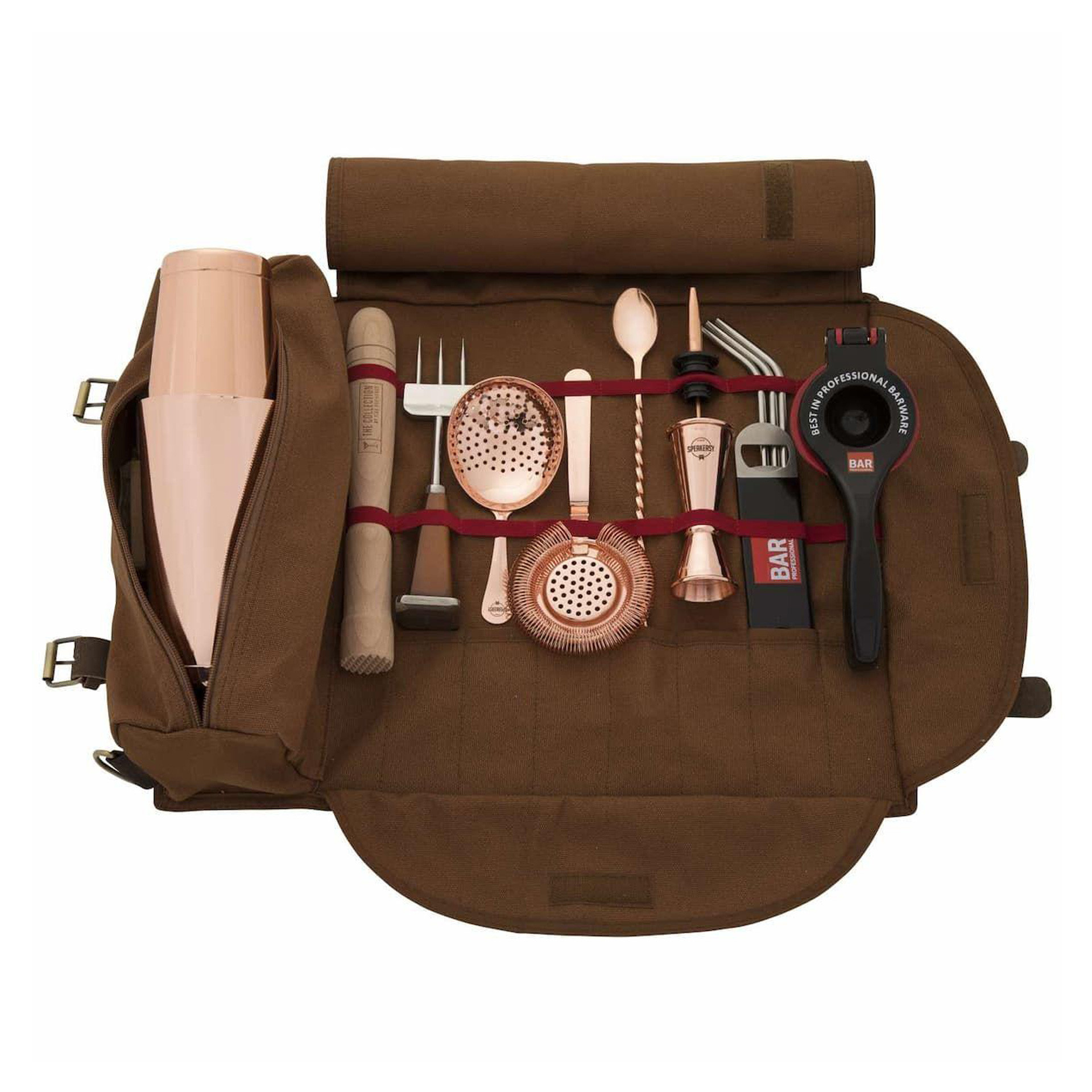 Torba nie zawiera sprzętu, ale możesz ją skompletować wybierając profesjonalny sprzęt barmański. Zdjęcie z wyposażeniem obrazuje przykładowe, optymalne ułożenie akcesoriów barmańskich.