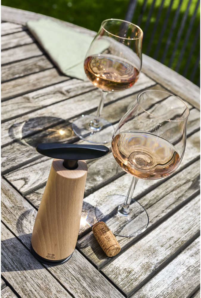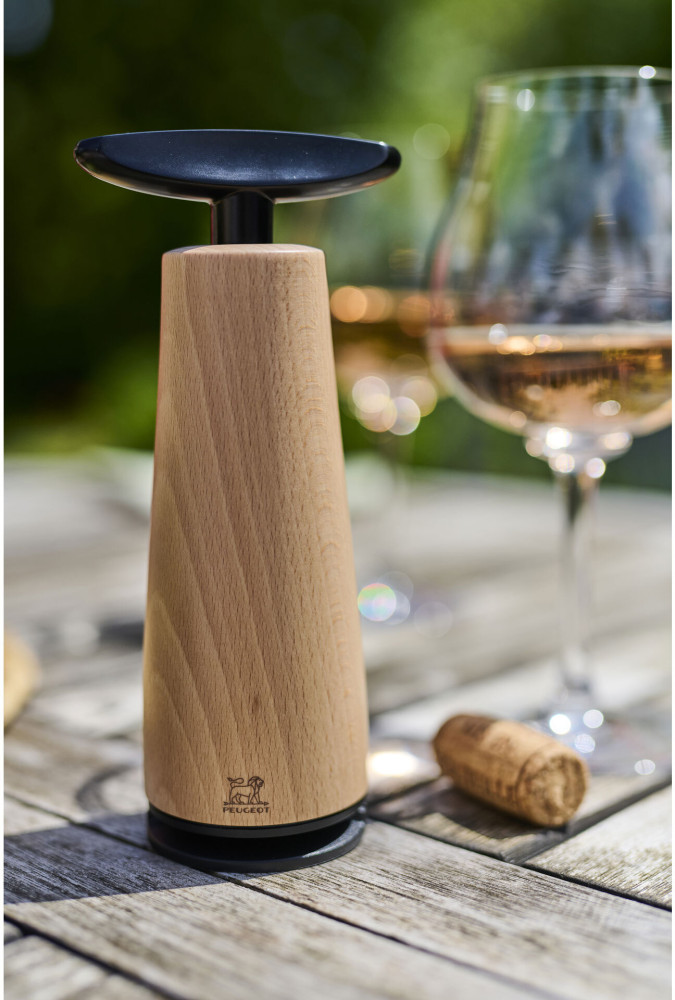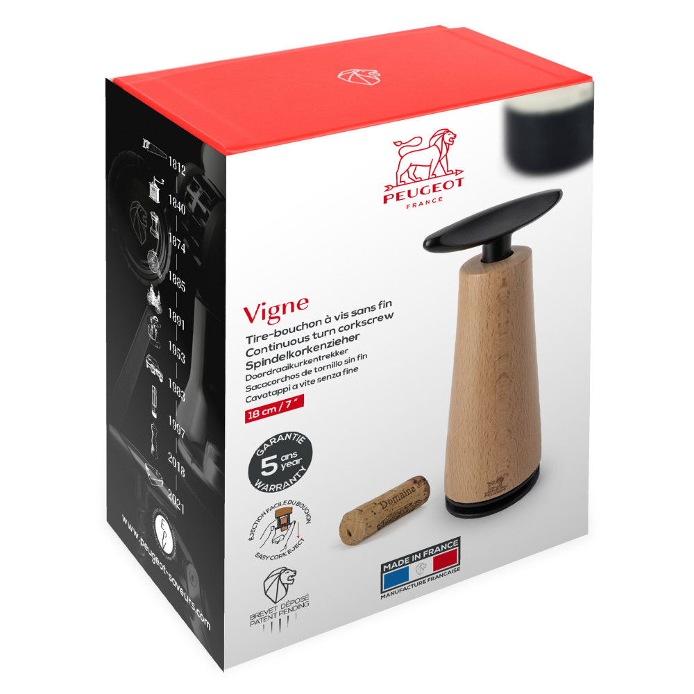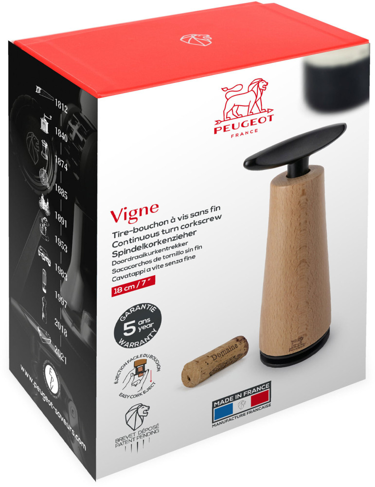 Korkociąg VIGNE to zaskakująca forma połączona z niezawodnym mechanizmem. Wykonany został z największą starannością z certyfikowanego drzewa orzechowego (PEFC). Delikatne, pionowe smugi drewna bukowego łącza się gustownie z ciemnymi elementami korkociągu. Czarny, designerski uchwyt nawiązuje swym kształtem do winorośli i korzeni. Innowacyjny, opatentowany przez firmę Peugeot mechanizm wyciągania korków zaskakuje pomysłowością i funkcjonalnością. Korkociąg Vigne to doskonały prezent dla wszystkich koneserów win. Korkociąg sprawdza się zarówno do wyciągania korków naturalnych jak i syntetycznych. Rękojeść korkociągu w kolorze czarnym wykonana jest ze stopu cynku znanego również pod nazwą ZAMAK.