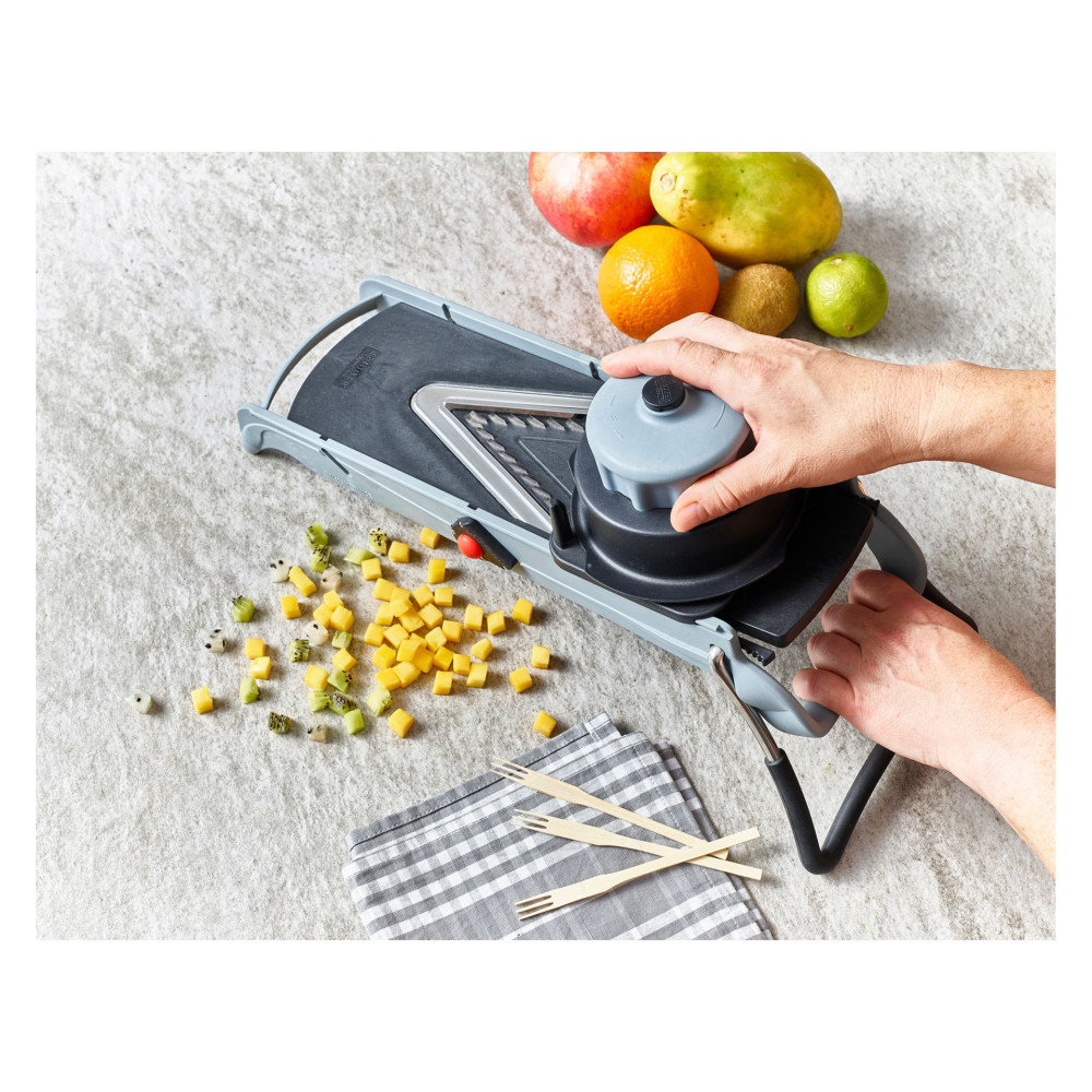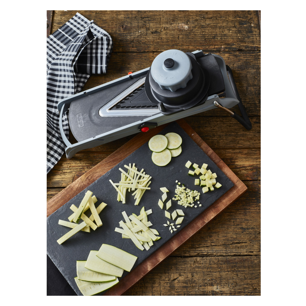 Mandolina daje możliwość krojenia w kostkę, plastry, i julienne 4 i 10 mm.