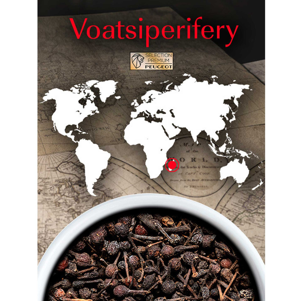 Pieprz Voatsiperifery ma wyjątkowy kwiatowo-owocowy smak. Oprócz łagodnej ostrości wyczuwa się zdecydowane nuty egzotycznych aromatów. Ten wyjątkowy, cenny pieprz rośnie dziko na południu Madagaskaru na pnączach, które osiągają wysokość do 20 metrów, co oznacza, że zbieranie ich jest trudnym zadaniem. Ziarna pieprzu, które są zazwyczaj małe i mają charakterystyczny ogonek, dostarczają wyrazistych drzewno- kwiatowo-owocowych smaków. Szczególnie dobrze komponuje się z mięsem (drób, wieprzowina i jagnięcina), warzywami (ziemniaki i sałatki), omletem i kozim serem, a także truskawkami, melonami i czekoladą.