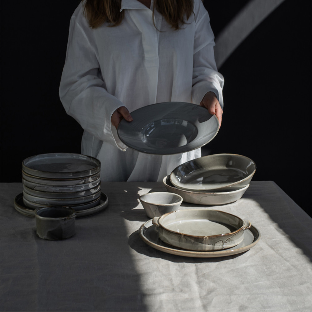 Stwórz pełną uroku aranżację stołową. Piękny połysk glazury, neutralna, minimalistyczna-ciepła szarość to idealna propozycja ponadczasowej zastawy stołowej. Płaskie i głębokie talerze, misy, brytfanny i ramekiny do zapiekania to podstawa do stworzenia kompletnej aranżacji stołu. Możesz łączyć i mieszać elementy kolekcji z innymi tworząc oryginalną kompozycję. Prostota, subtelność i nawiązanie do rękodzieła, to kwintesencja tej kolekcji. Przygotowane dania możesz zapiekać w temp. do 200 stopni i serwować je bezpośrednio po wyjęciu z piekarnika.