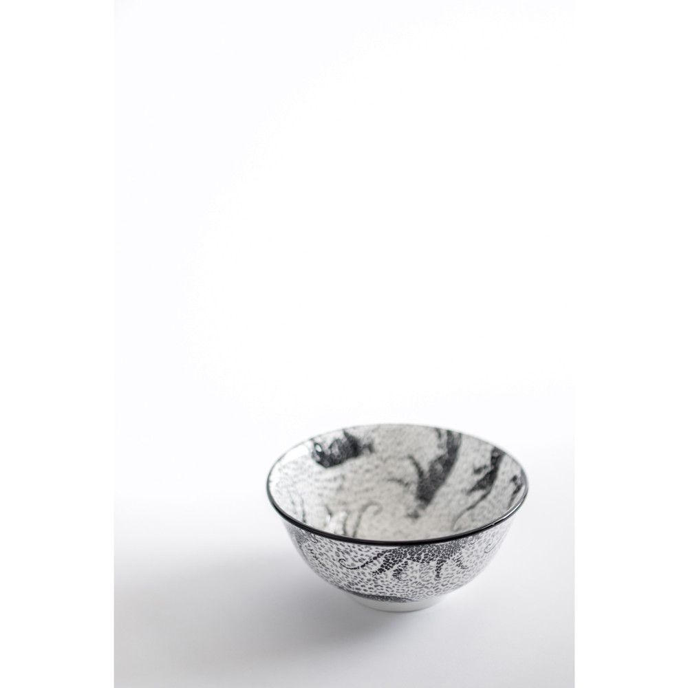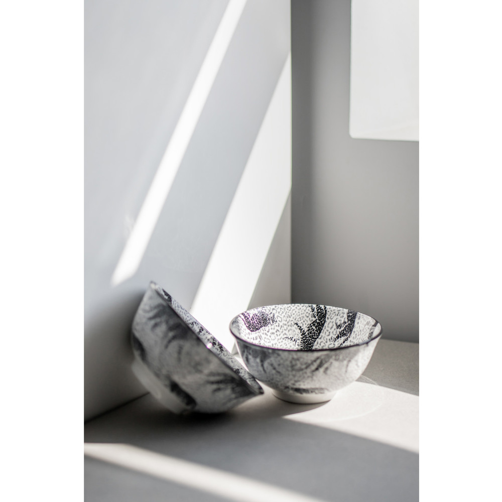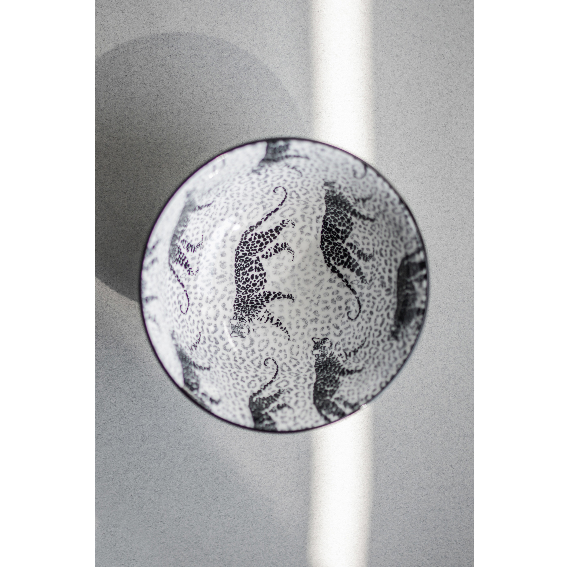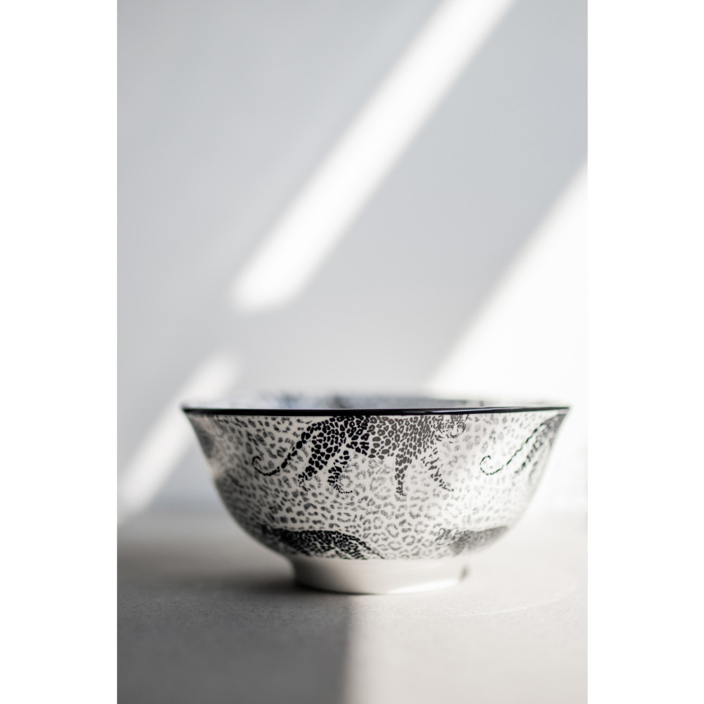 Asortyment tej kolekcji obejmuje płaskie talerze, talerze głębokie oraz miseczki, wszystko to ozdobione dwoma wyjątkowymi, czarno-białymi wzorami inspirowanymi motywami zwierzęcymi. Charakterystyczne wykończenie rantu naczynia w ciemnym, jednolitym kolorze doskonale uzupełnia wzory, tworząc kompletną kompozycję.