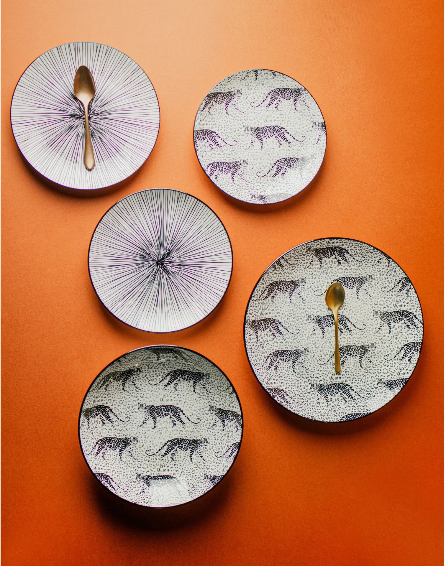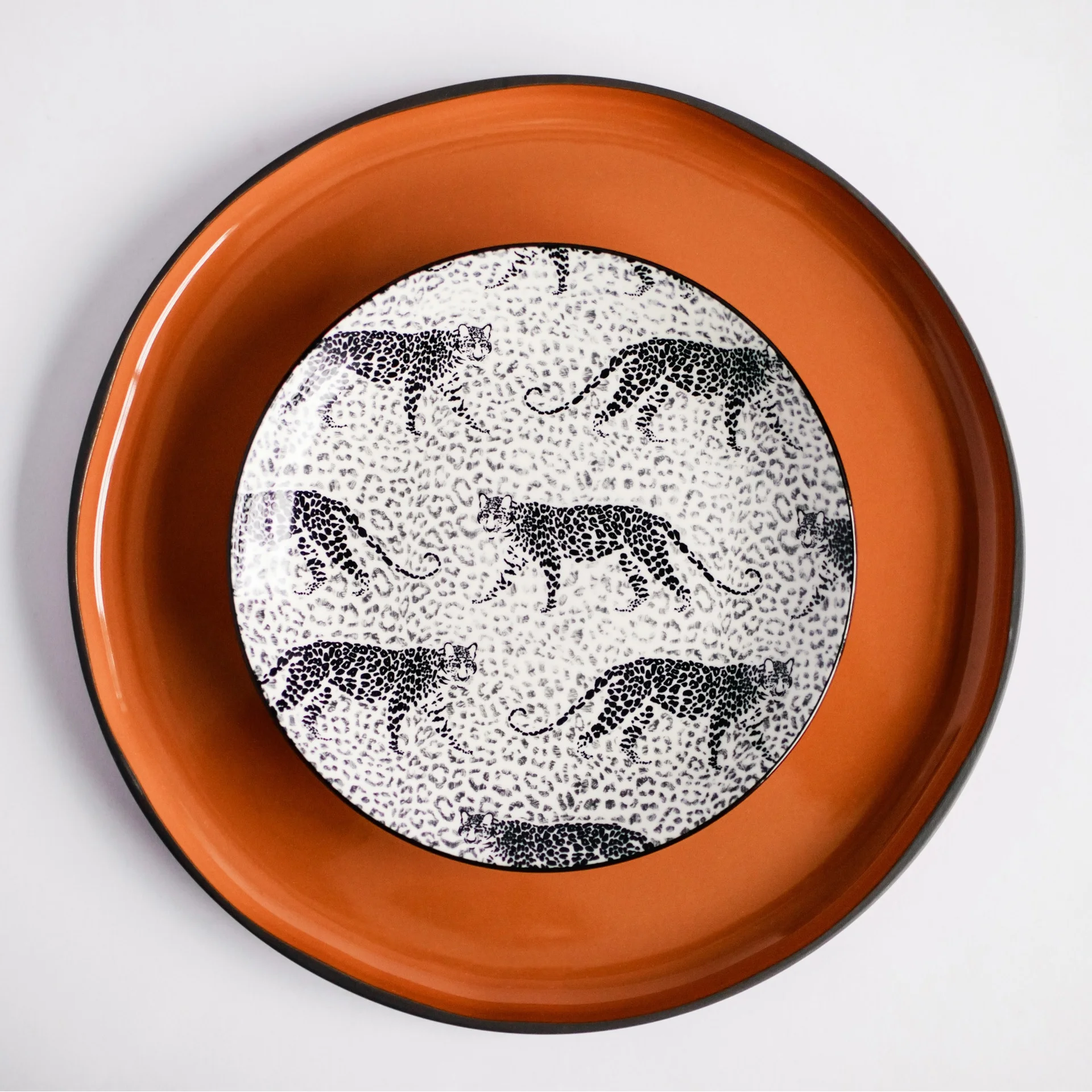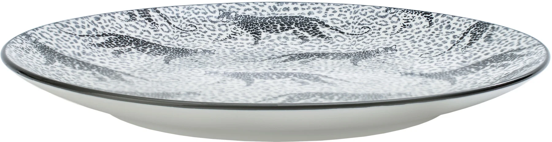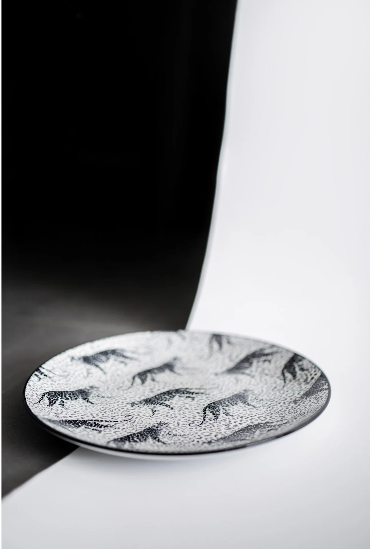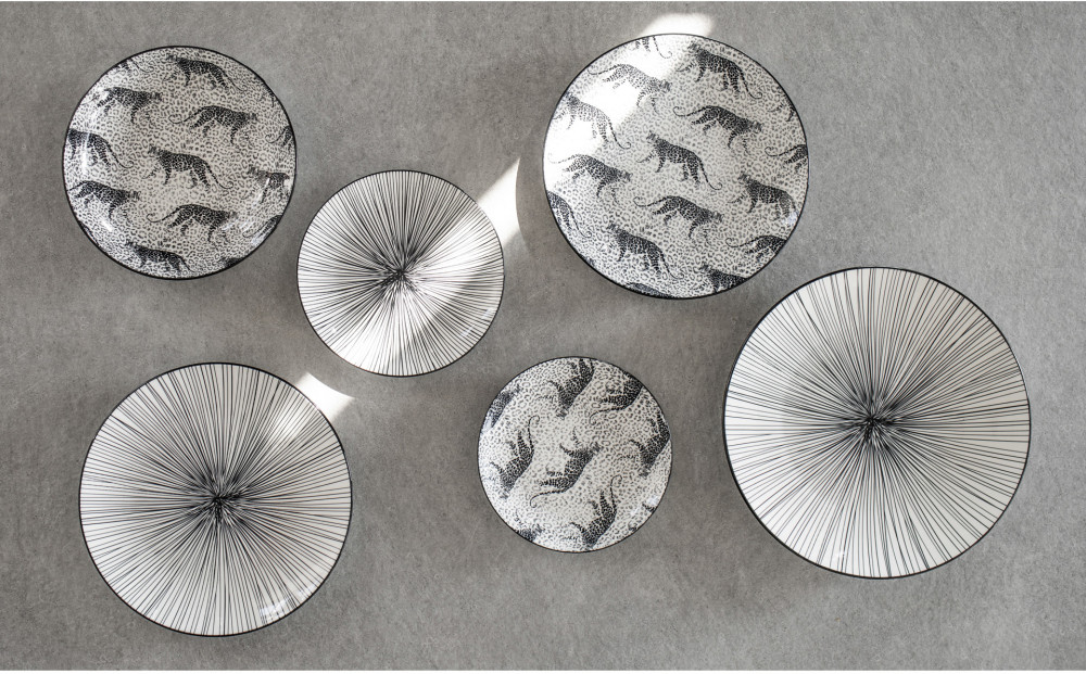 Asortyment tej kolekcji obejmuje płaskie talerze, talerze głębokie oraz miseczki, wszystko to ozdobione dwoma wyjątkowymi, czarno-białymi wzorami inspirowanymi motywami zwierzęcymi. Charakterystyczne wykończenie rantu naczynia w ciemnym, jednolitym kolorze doskonale uzupełnia wzory, tworząc kompletną kompozycję.