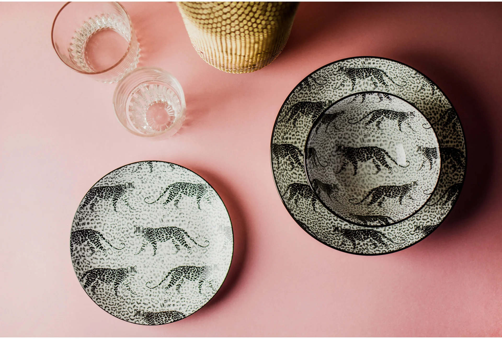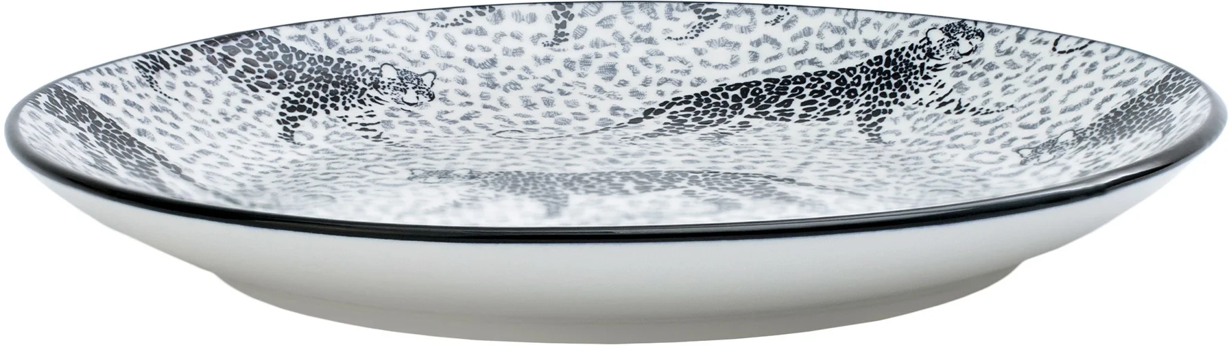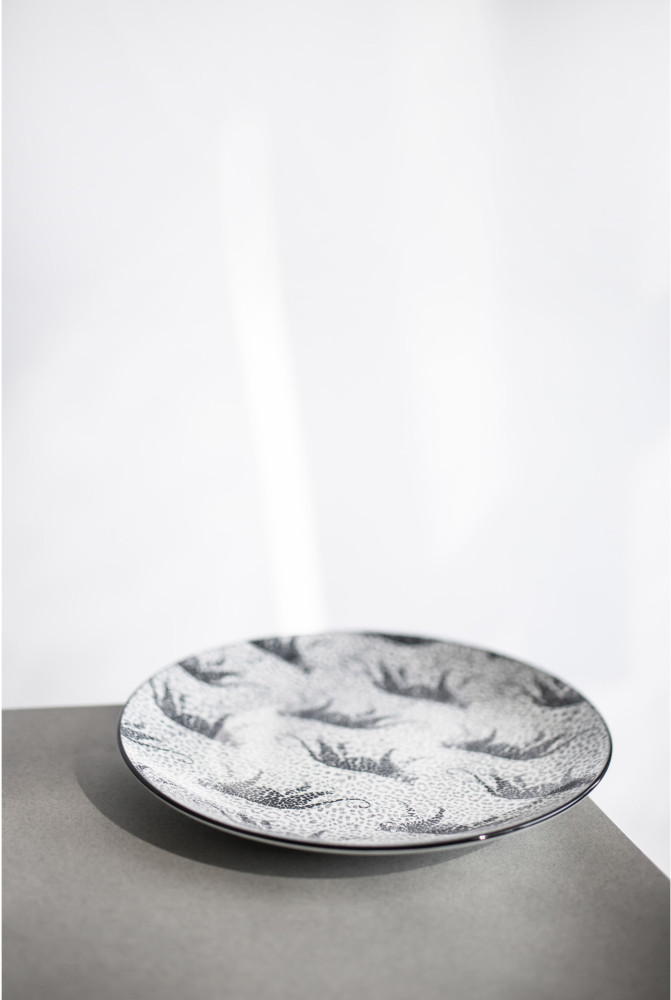 Asortyment tej kolekcji obejmuje płaskie talerze, talerze głębokie oraz miseczki, wszystko to ozdobione dwoma wyjątkowymi, czarno-białymi wzorami inspirowanymi motywami zwierzęcymi. Charakterystyczne wykończenie rantu naczynia w ciemnym, jednolitym kolorze doskonale uzupełnia wzory, tworząc kompletną kompozycję.
