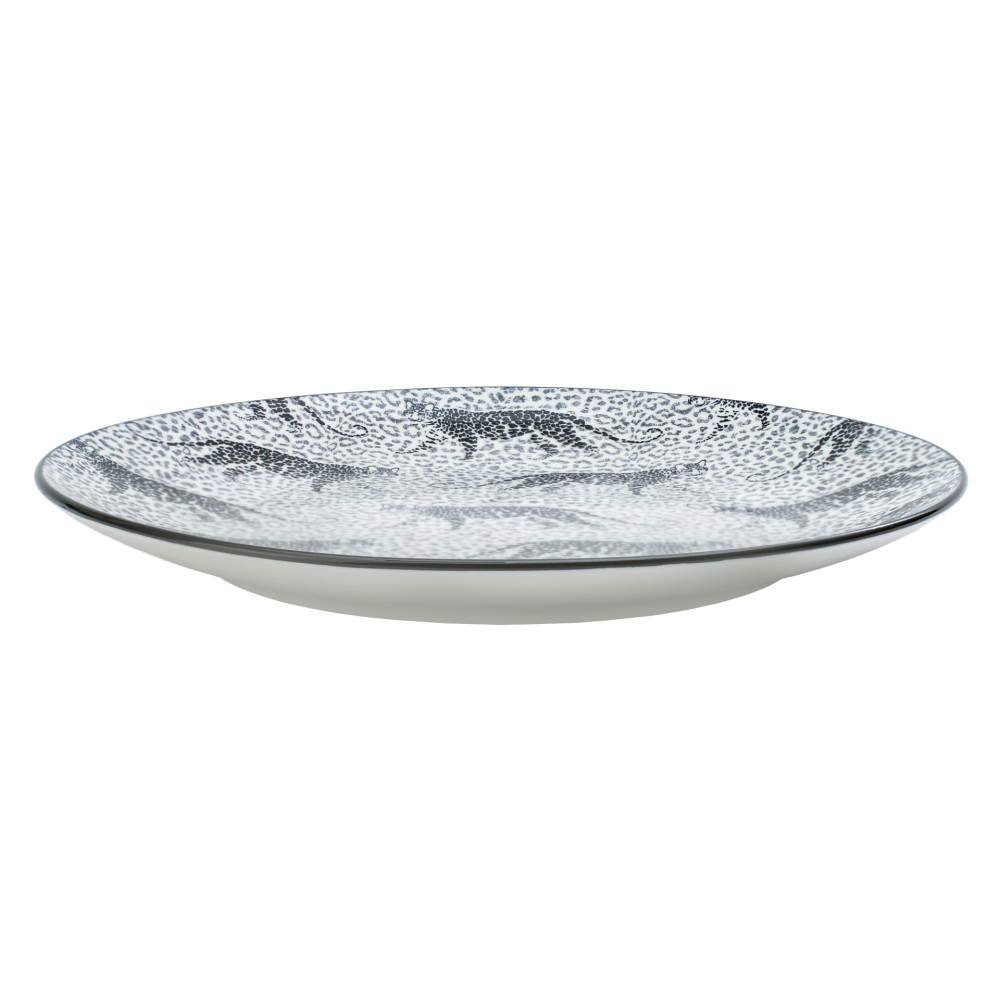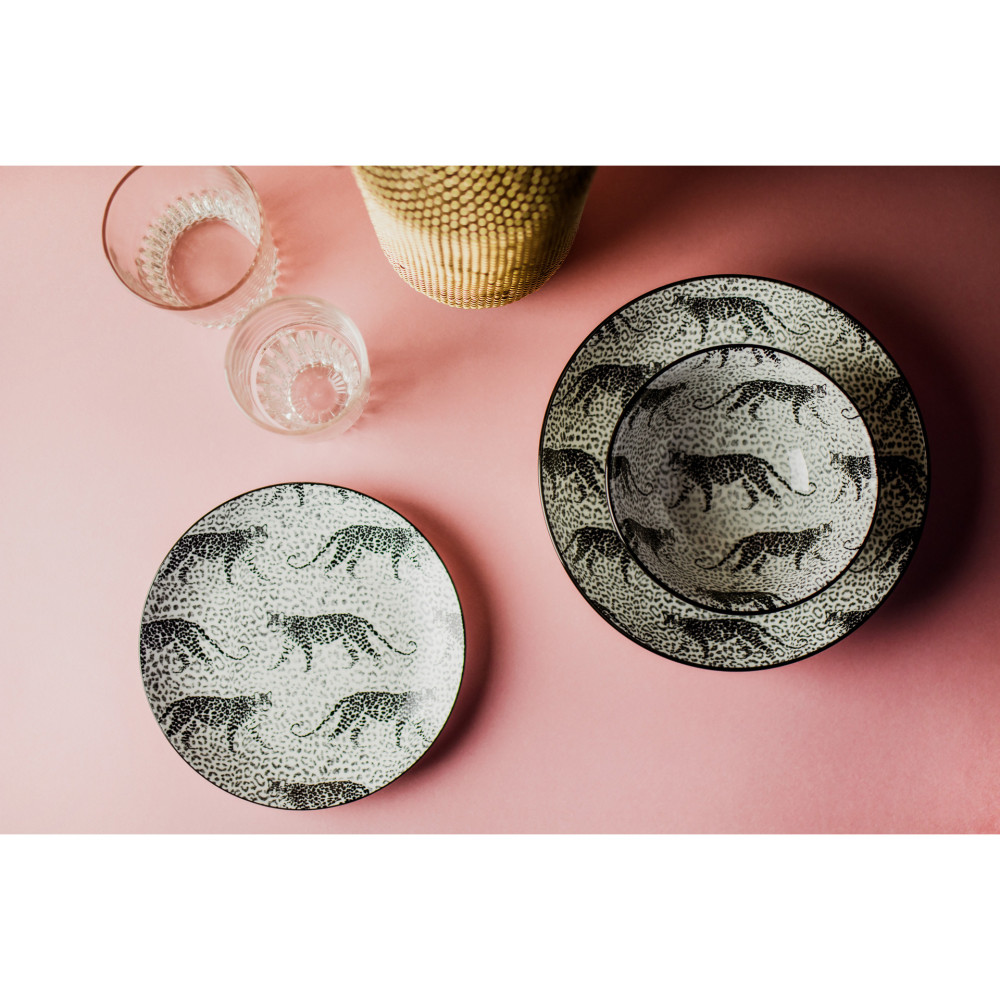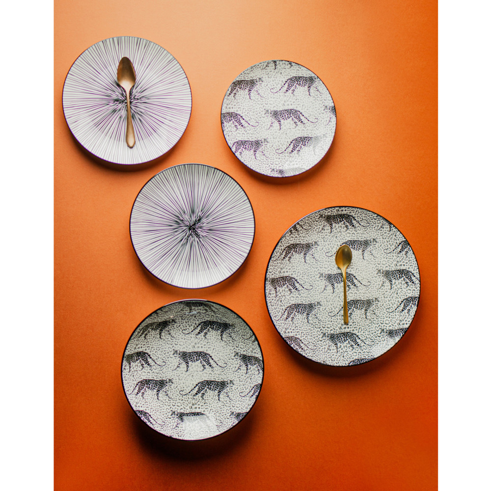 Asortyment tej kolekcji obejmuje płaskie talerze, talerze głębokie oraz miseczki, wszystko to ozdobione dwoma wyjątkowymi, czarno-białymi wzorami inspirowanymi motywami zwierzęcymi. Charakterystyczne wykończenie rantu naczynia w ciemnym, jednolitym kolorze doskonale uzupełnia wzory, tworząc kompletną kompozycję.
