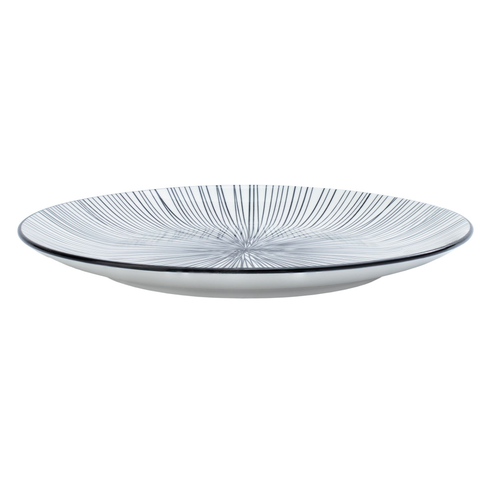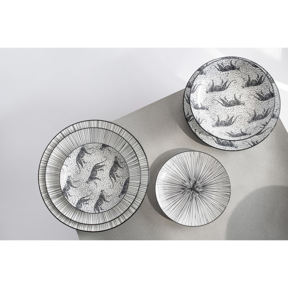 Asortyment tej kolekcji obejmuje płaskie talerze, talerze głębokie oraz miseczki, wszystko to ozdobione dwoma wyjątkowymi, czarno-białymi wzorami inspirowanymi motywami zwierzęcymi. Charakterystyczne wykończenie rantu naczynia w ciemnym, jednolitym kolorze doskonale uzupełnia wzory, tworząc kompletną kompozycję.