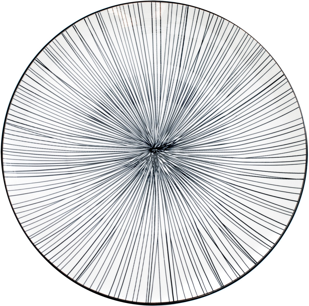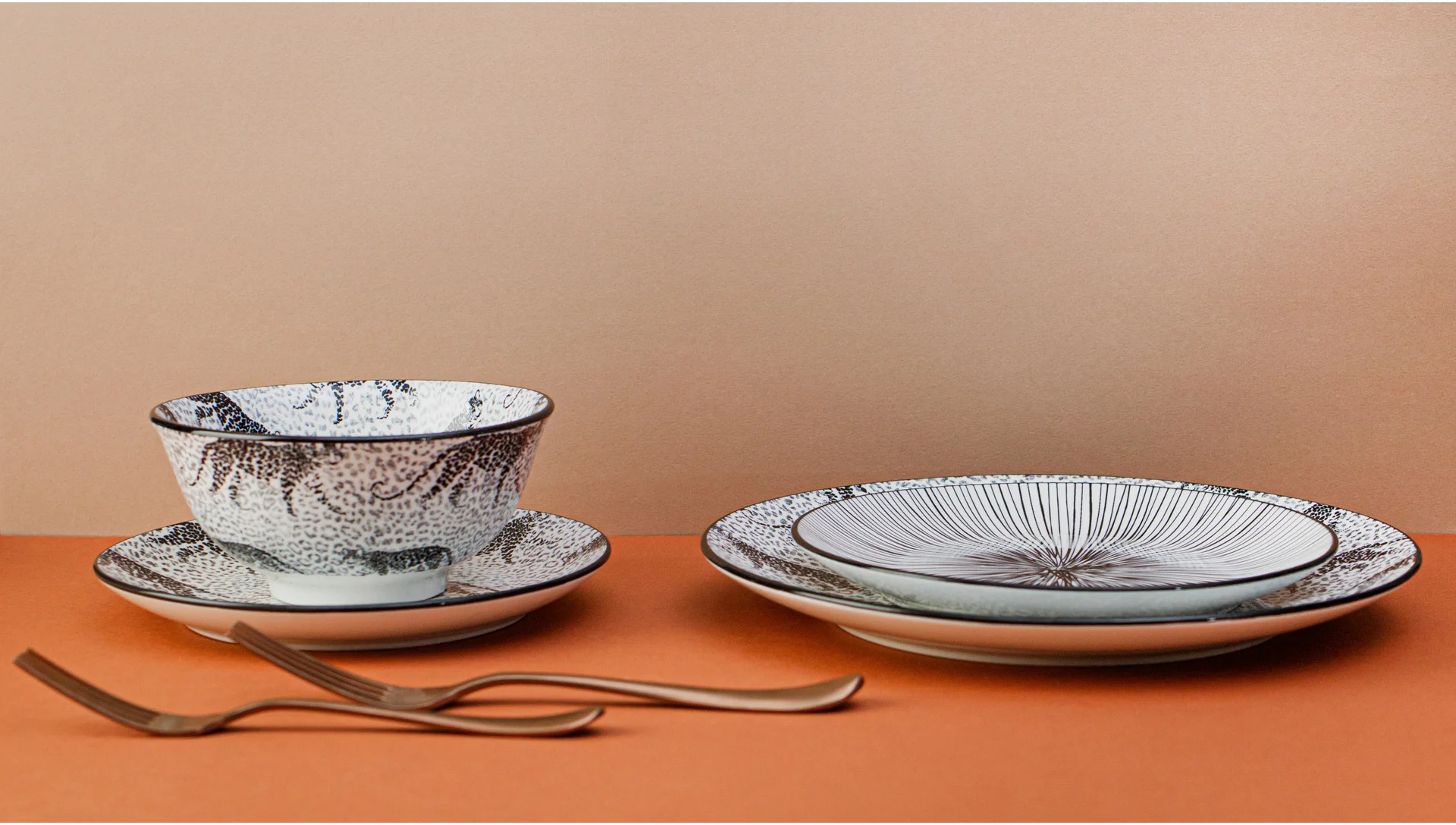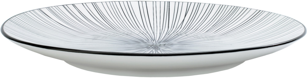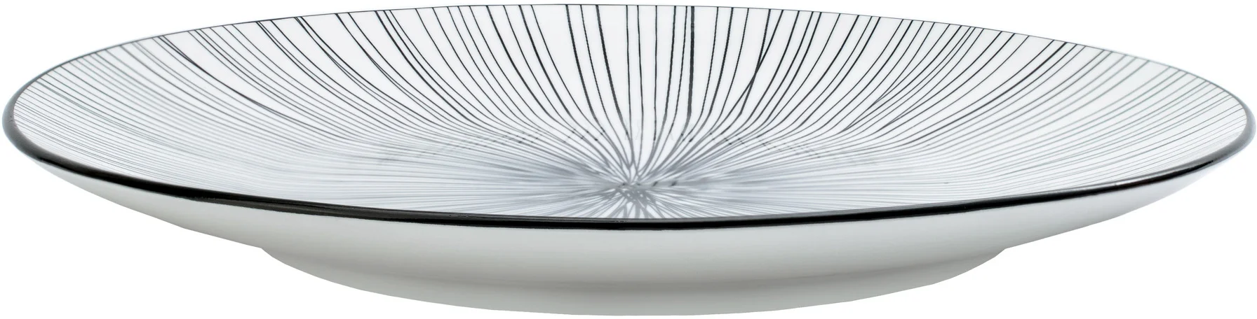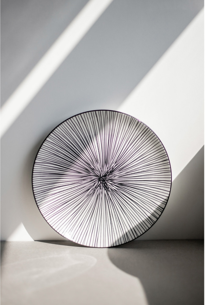 Asortyment tej kolekcji obejmuje płaskie talerze, talerze głębokie oraz miseczki, wszystko to ozdobione dwoma wyjątkowymi, czarno-białymi wzorami inspirowanymi motywami zwierzęcymi. Charakterystyczne wykończenie rantu naczynia w ciemnym, jednolitym kolorze doskonale uzupełnia wzory, tworząc kompletną kompozycję.