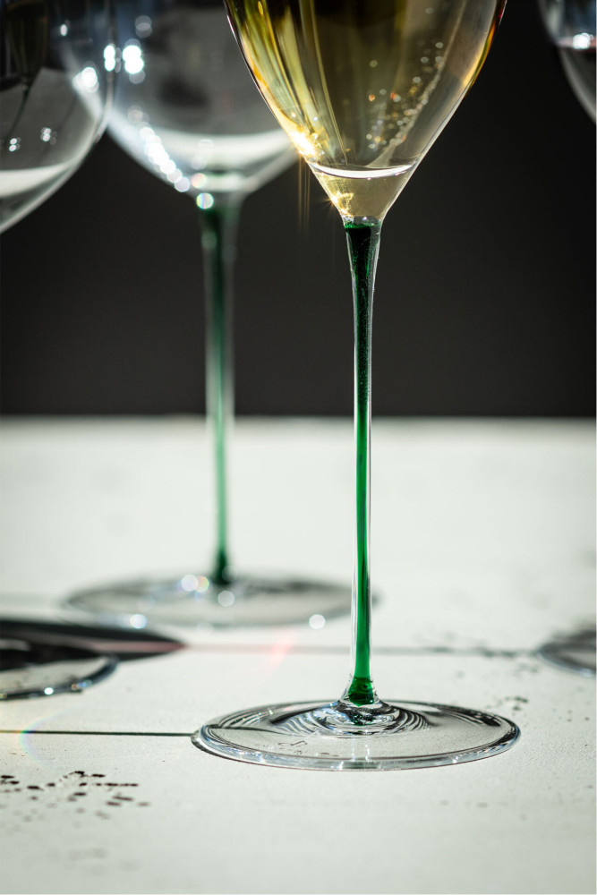 Kolekcja obejmuje trzy kształty kieliszków: do szampana, białego wina i czerwonego wina. To, co je wyróżnia, to eleganckie, kolorowe nóżki w odcieniach: zielony beryl, wiśniowa czerwień i jasny niebieski. Każda nóżka różni się delikatnie intensywnością i strukturą barwienia, co czyni każdy egzemplarz unikalnym dziełem sztuki użytkowej.
