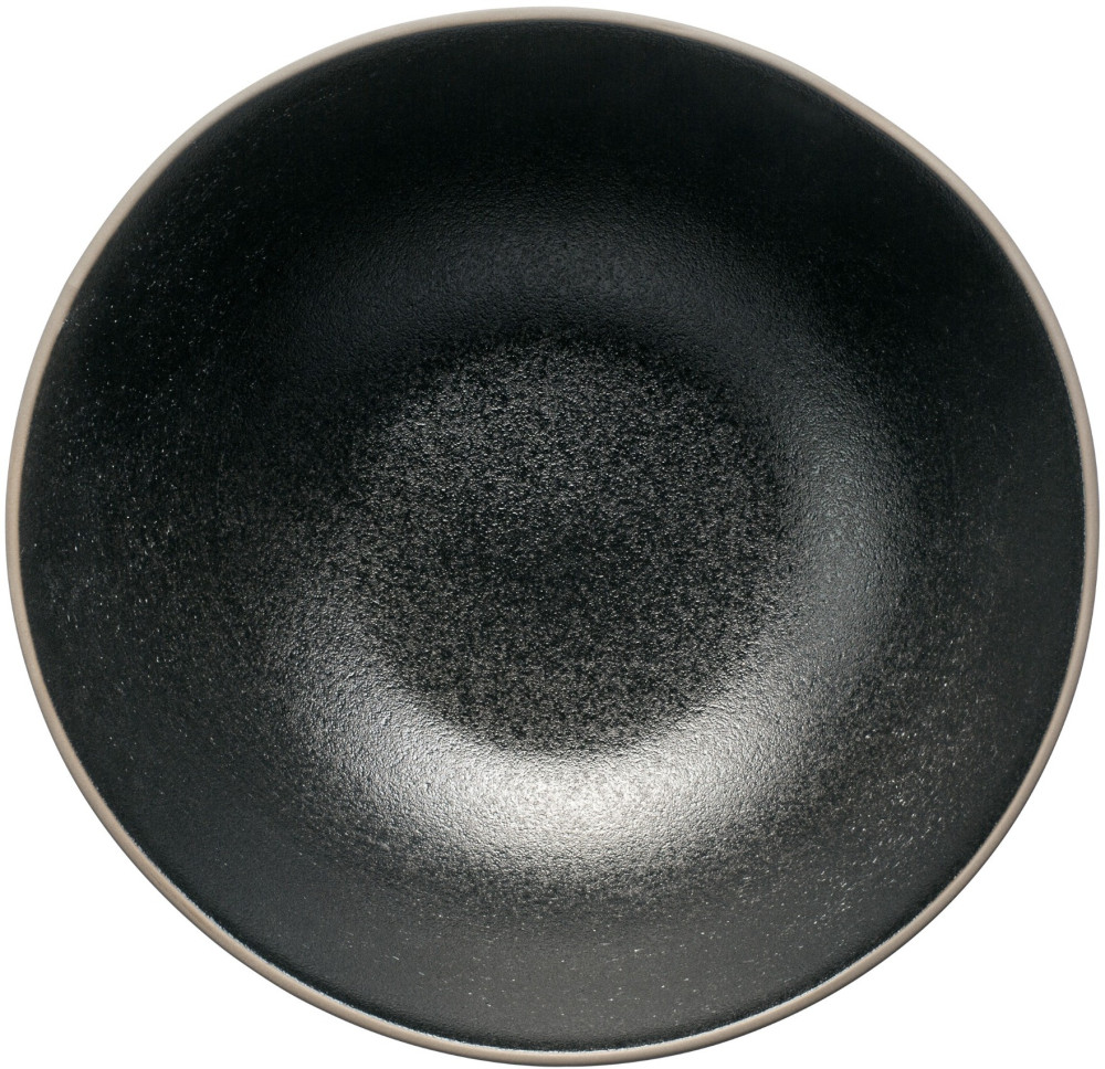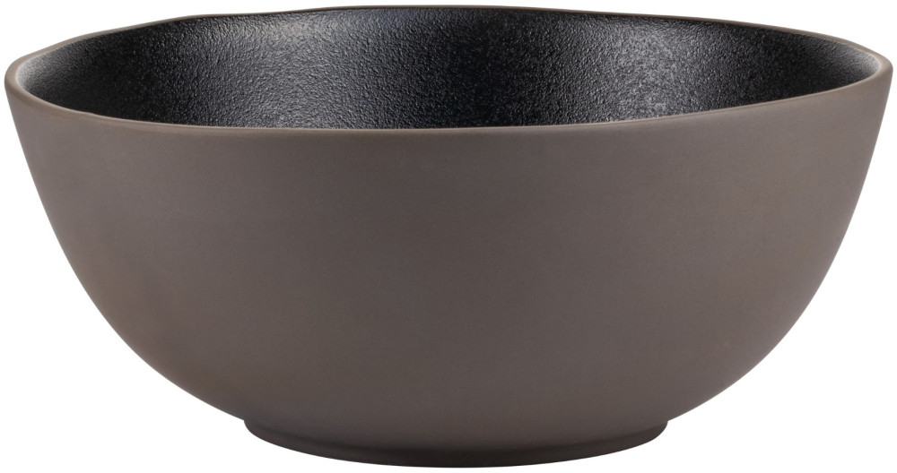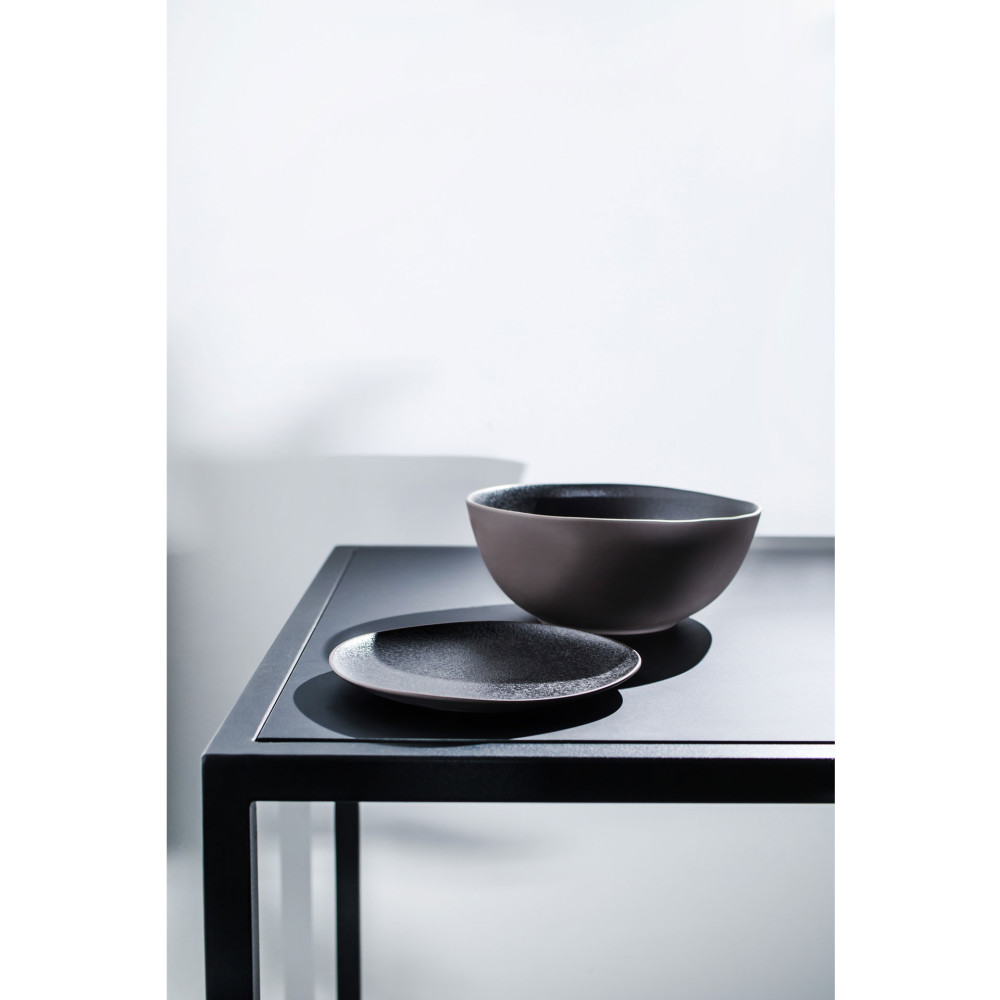 Dwa płaskie talerze o ciekawym, nieregularnym kształcie oraz misa o dużej pojemności będzie idealnym sposobem serowania przystawek, dań bufetowych, sałatek. Połączenie idealnie gładkiej, aksamitnej zewnętrznej struktury naczyń, z szorstkością w jej wewnętrznych częściach, pięknie uwydatnia minimalistyczną formę i oryginalne, niesymetryczne wykończenia krawędzi. Daje to efekt ręcznego wyrabiania i wykańczania naczyń. Niezwykle efektowne jest połączenie ciemnych barw. Brąz na zewnętrznej, aksamitnej powierzchni w połączeniu z głęboką czernią o półmatowym wykończeniu, to piękne scalenie dwóch szlachetnych kolorów.