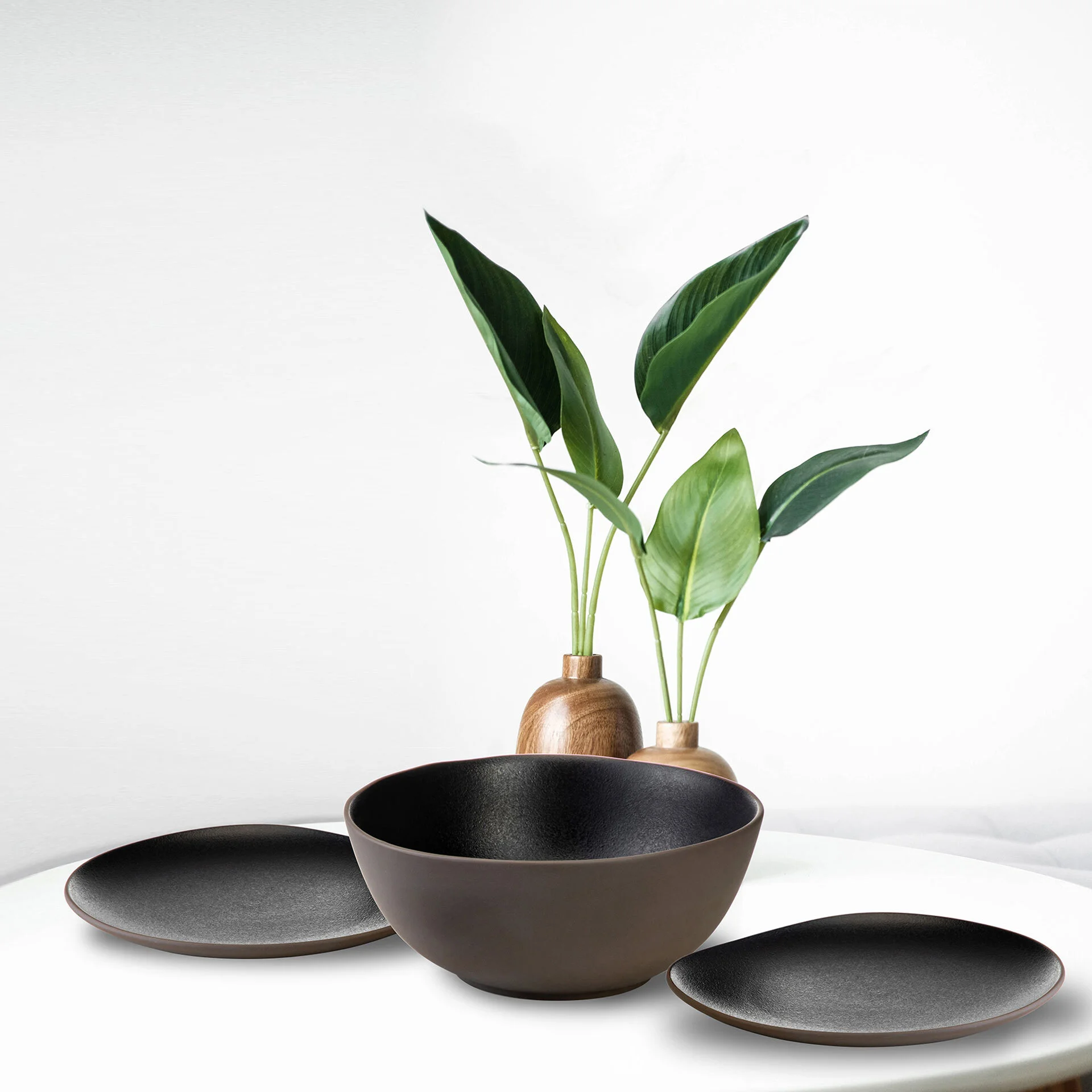 Dwa płaskie talerze o ciekawym, nieregularnym kształcie oraz misa o dużej pojemności będzie idealnym sposobem serowania przystawek, dań bufetowych, sałatek. Połączenie idealnie gładkiej, aksamitnej zewnętrznej struktury naczyń, z szorstkością w jej wewnętrznych częściach, pięknie uwydatnia minimalistyczną formę i oryginalne, niesymetryczne wykończenia krawędzi. Daje to efekt ręcznego wyrabiania i wykańczania naczyń. Niezwykle efektowne jest połączenie ciemnych barw. Brąz na zewnętrznej, aksamitnej powierzchni w połączeniu z głęboką czernią o półmatowym wykończeniu, to piękne scalenie dwóch szlachetnych kolorów.