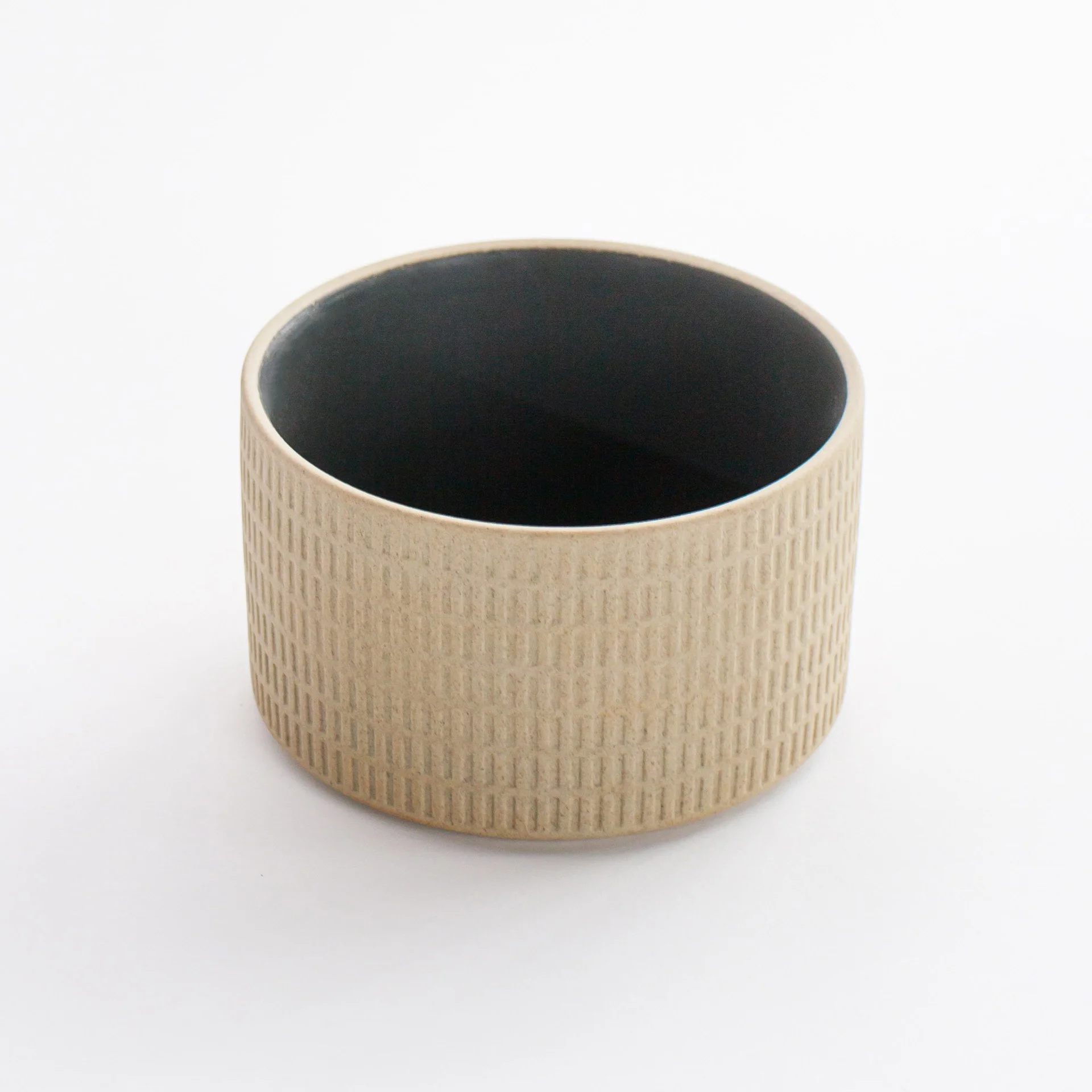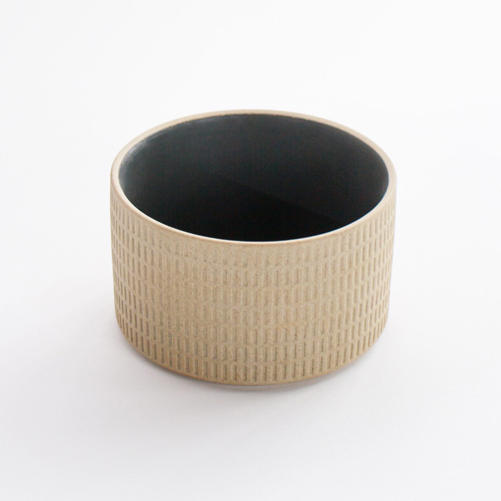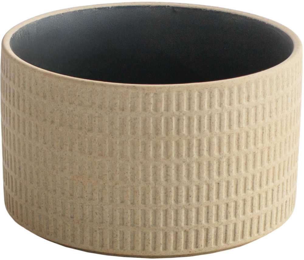 Naczynie z tej linii to doskonały przykład równowagi między estetyką a funkcjonalnością. Wnętrze pokrywa matowa, grafitowa glazura, która w subtelny sposób kontrastuje z piaskową powierzchnią w naturalnym odcieniu beżu. Charakterystyczny, tłoczony wzór na zewnętrznej stronie nie tylko przyciąga wzrok, ale też podkreśla rzemieślniczy charakter produktu.
